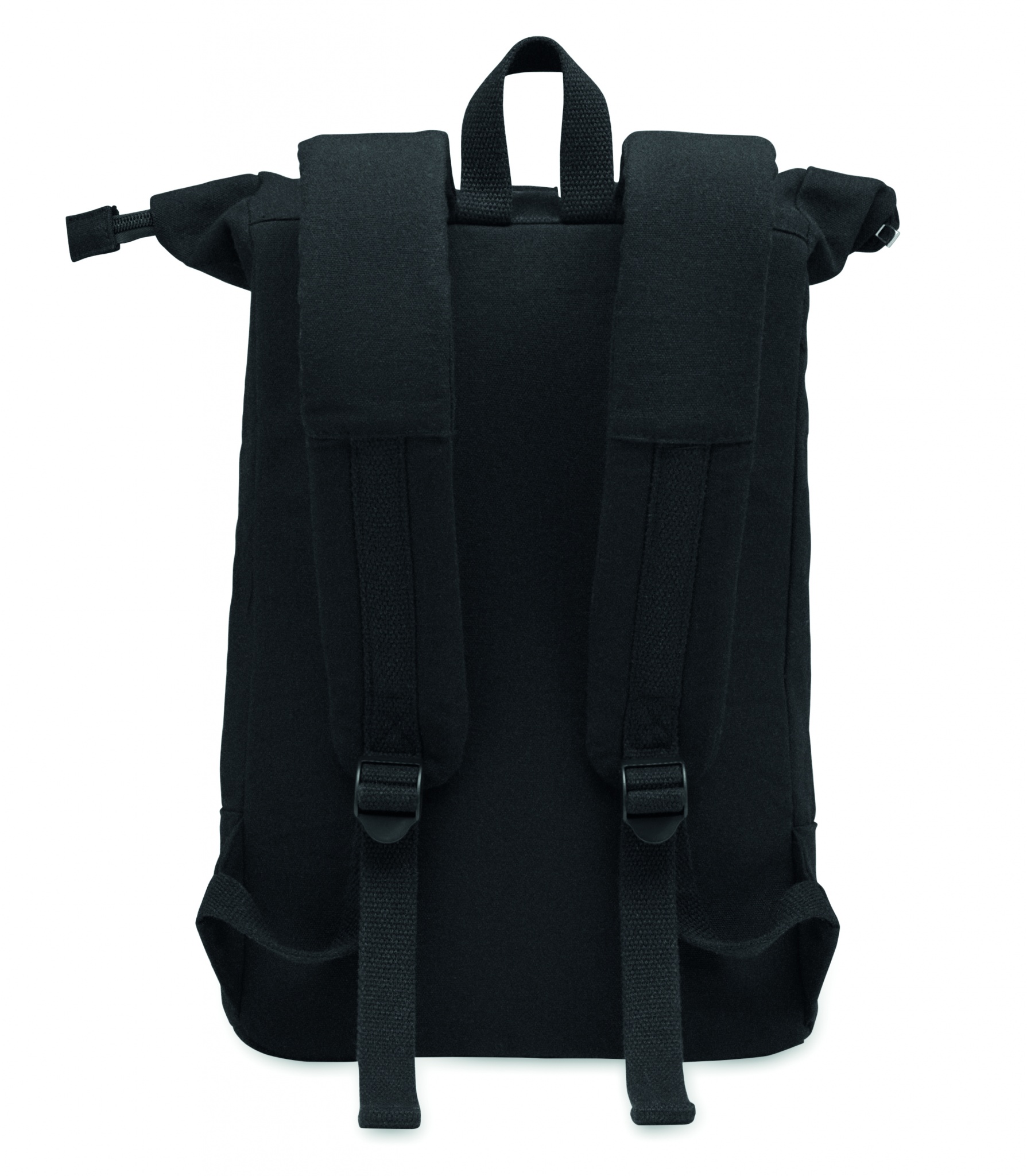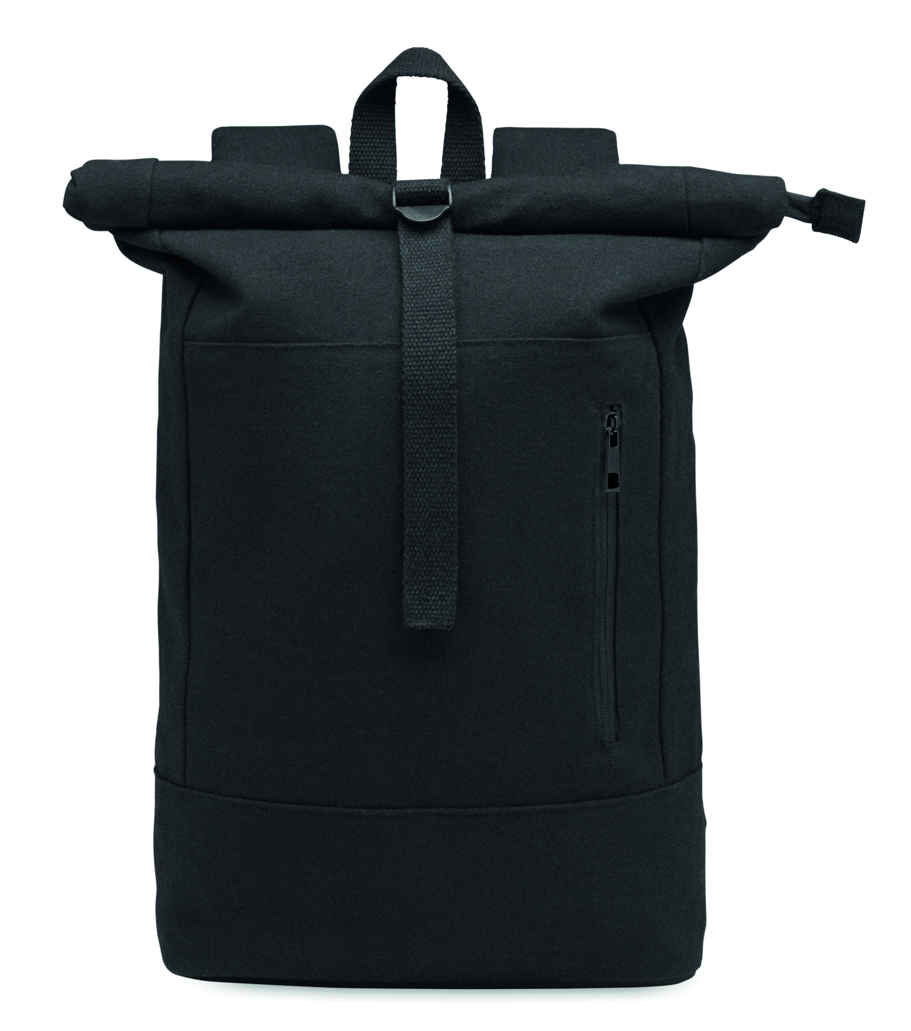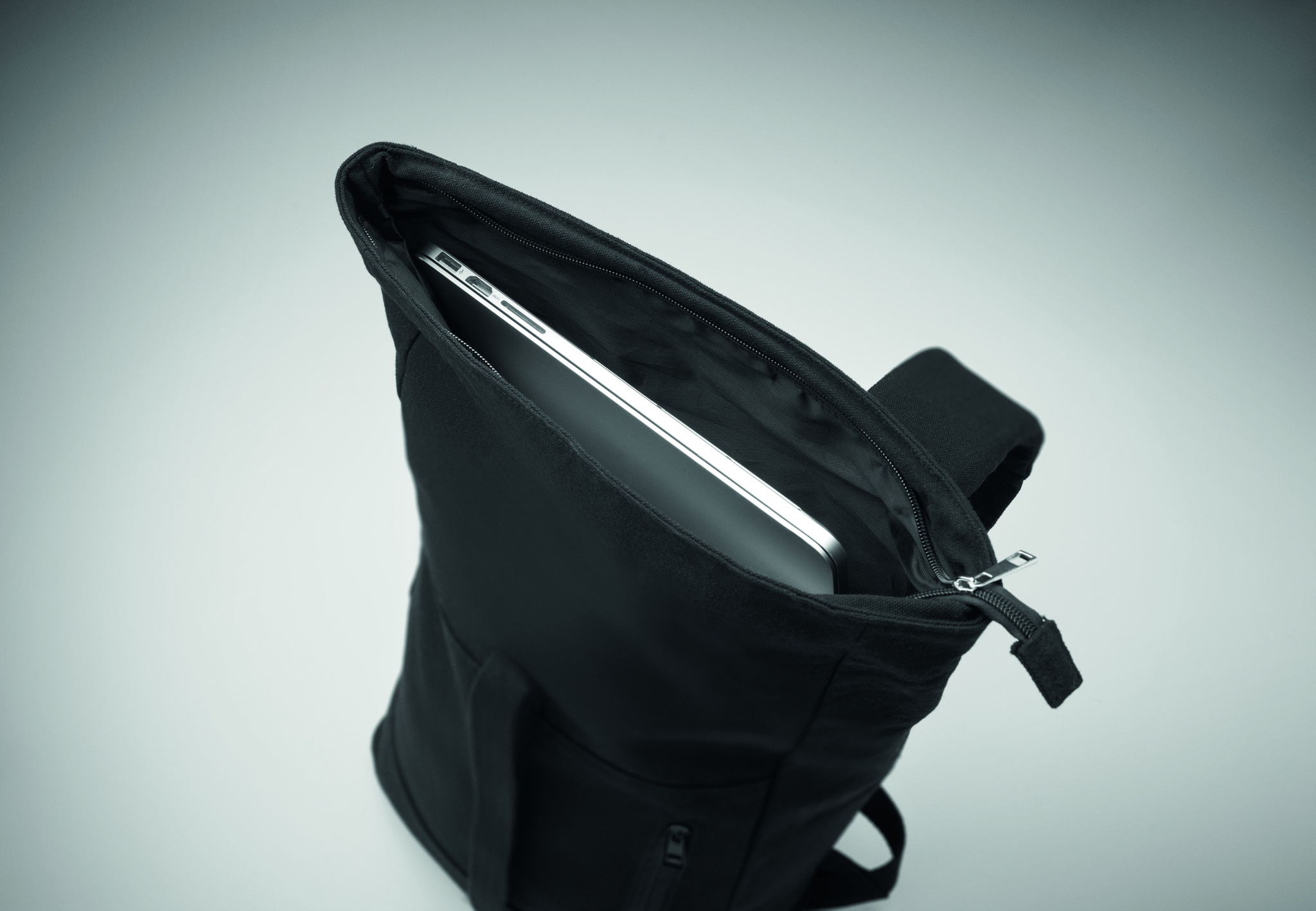 Zippered rolltop 15 inch laptop backpack in recycled pre-consumer cotton and recycled polyester (70%/30%). Front zippered pocket. Padded back and shoulder straps. 340gr/m².