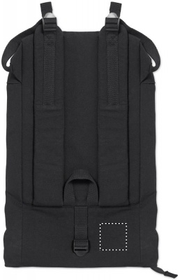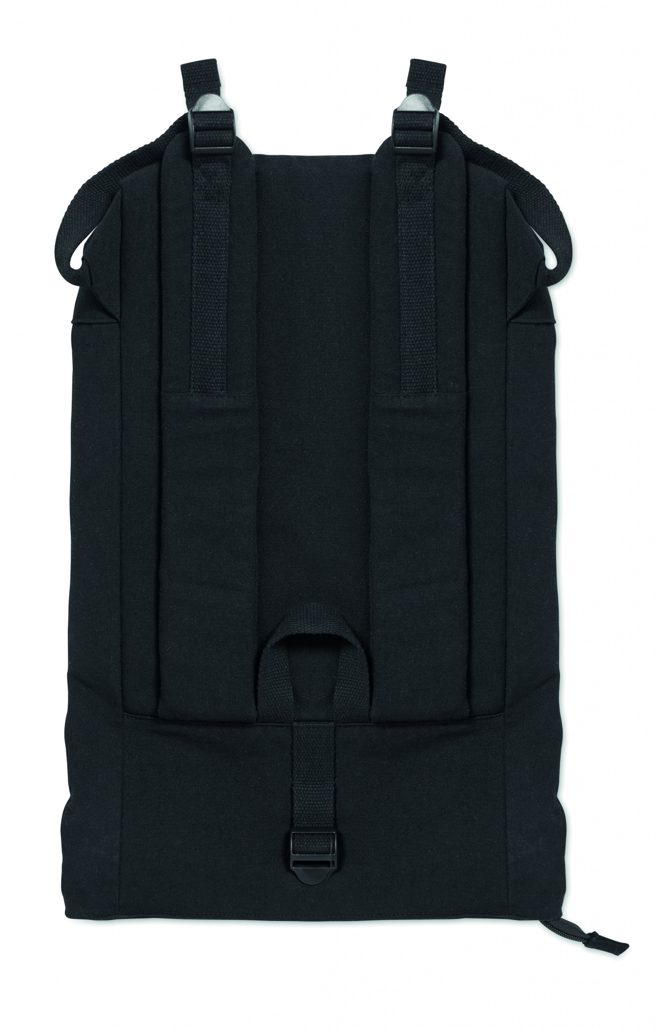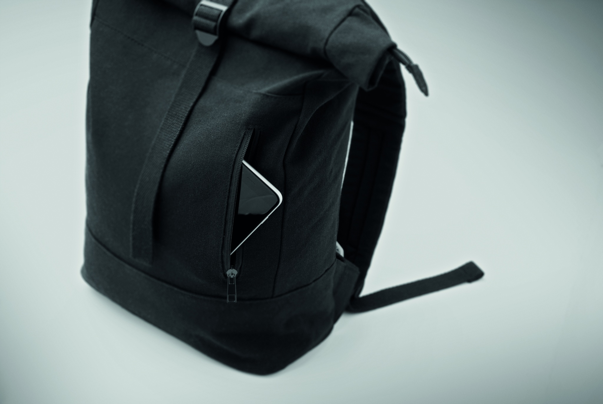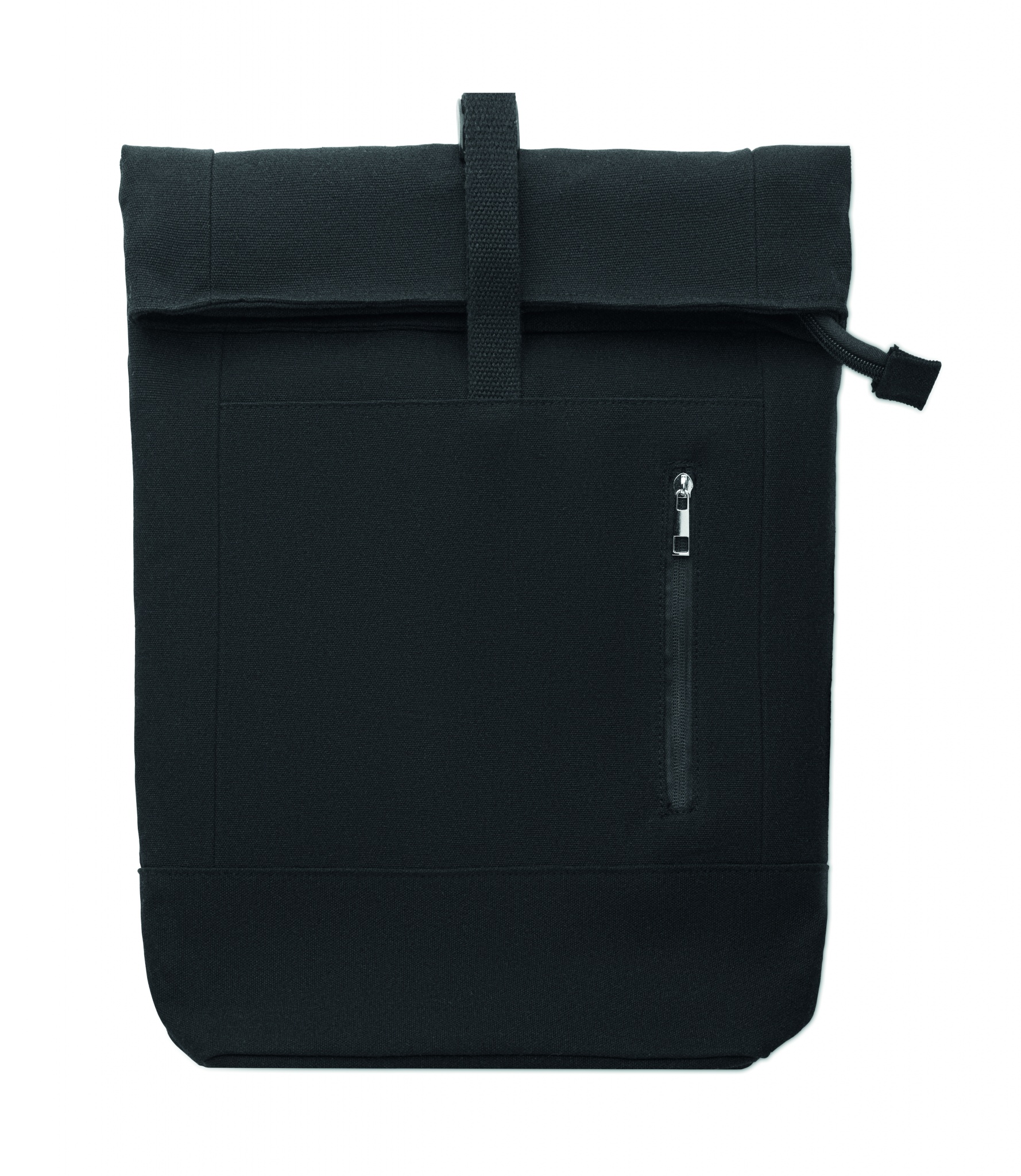 Zippered rolltop 15 inch laptop backpack in recycled pre-consumer cotton and recycled polyester (70%/30%). Front zippered pocket. Padded back and shoulder straps. 340gr/m².