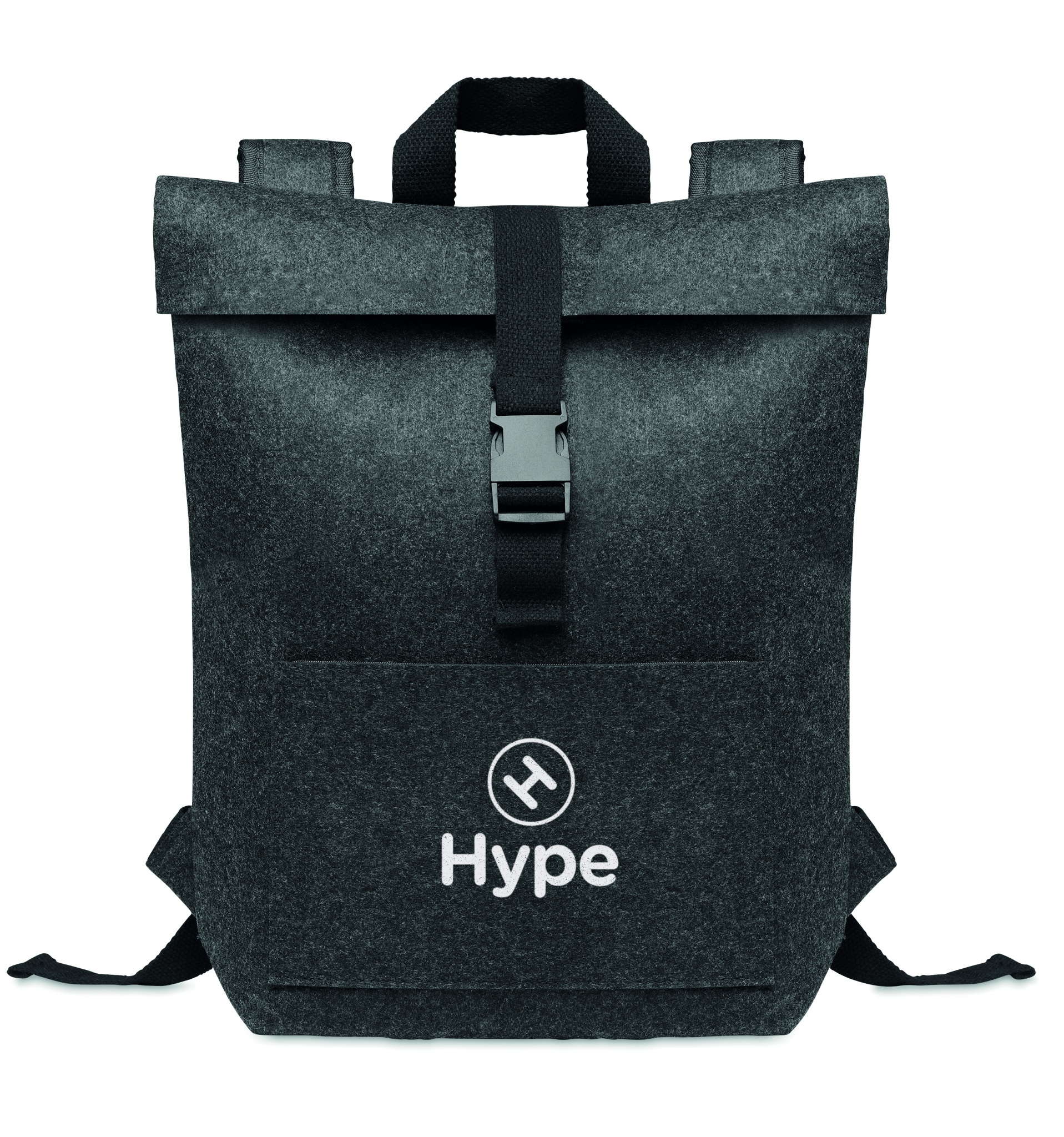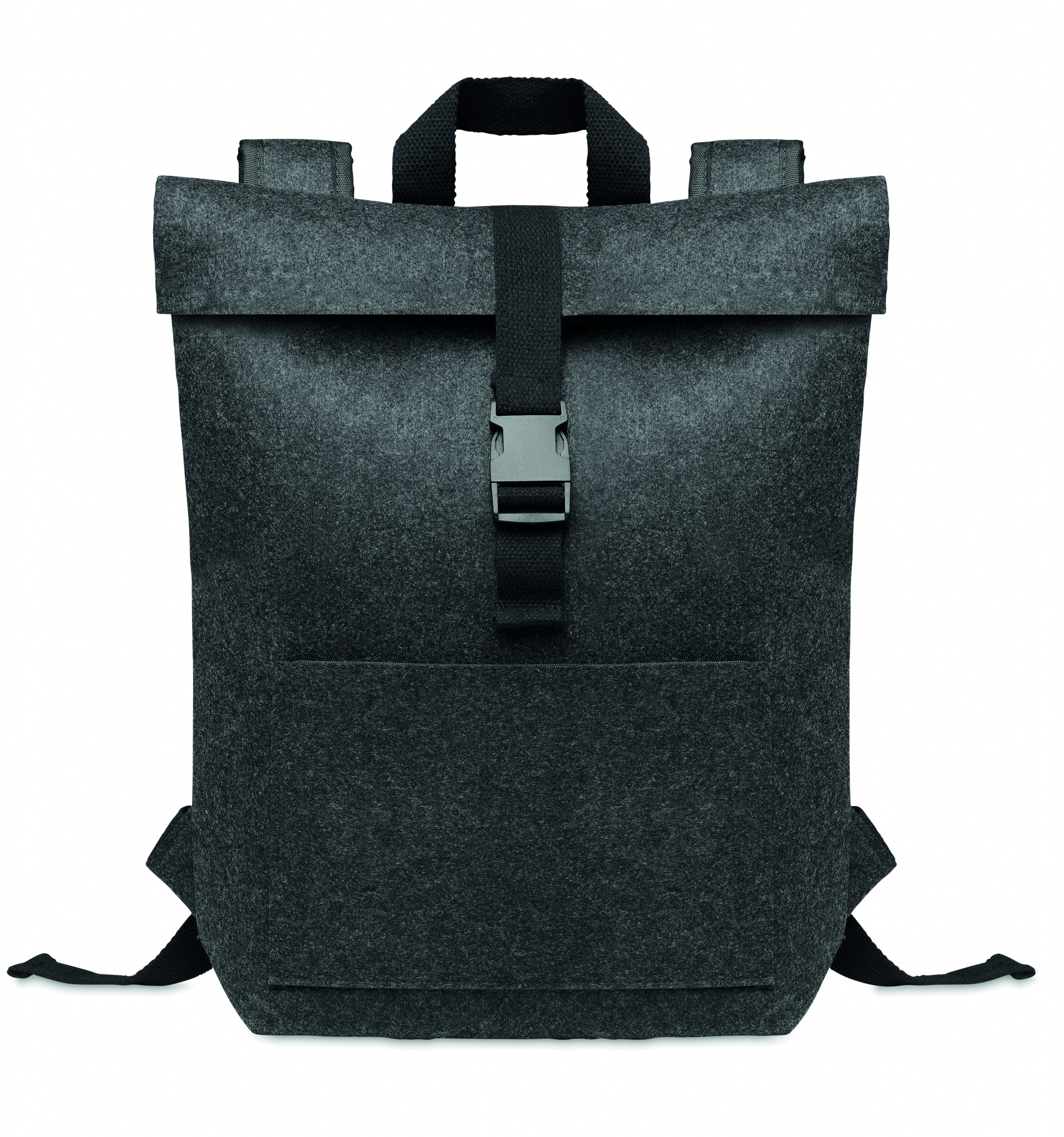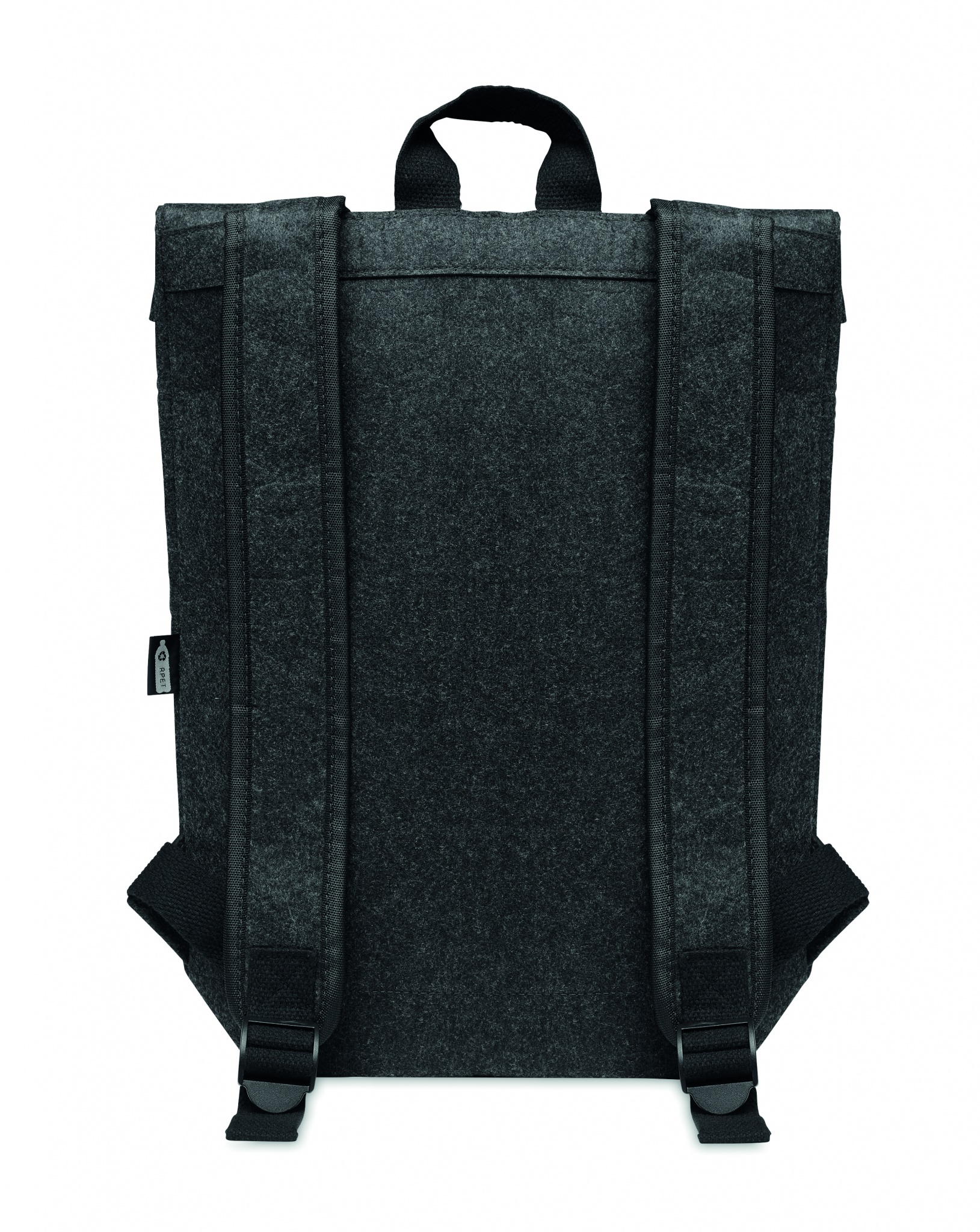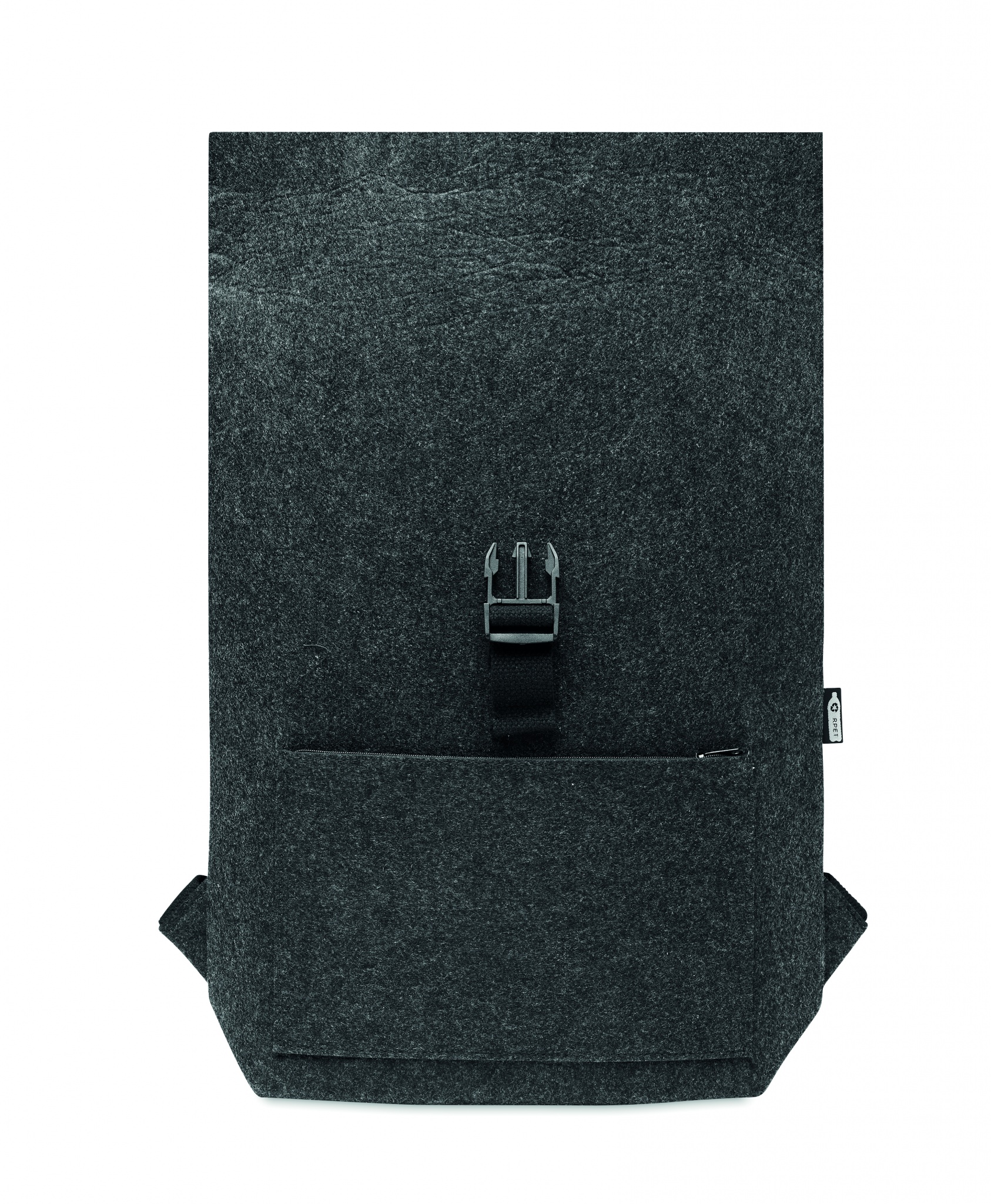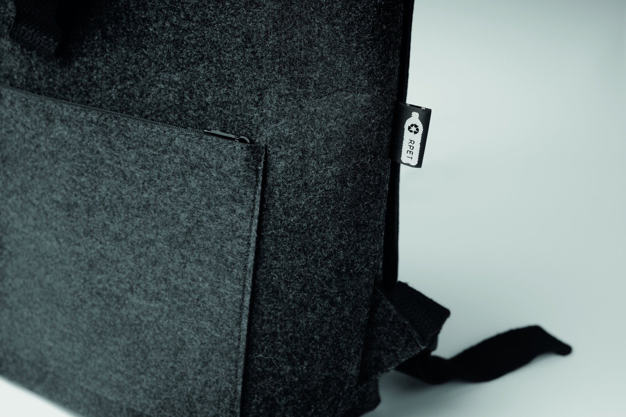 RPET felt backpack with cotton strap closure and zippered pocket on the front. It has a laptop compartment.