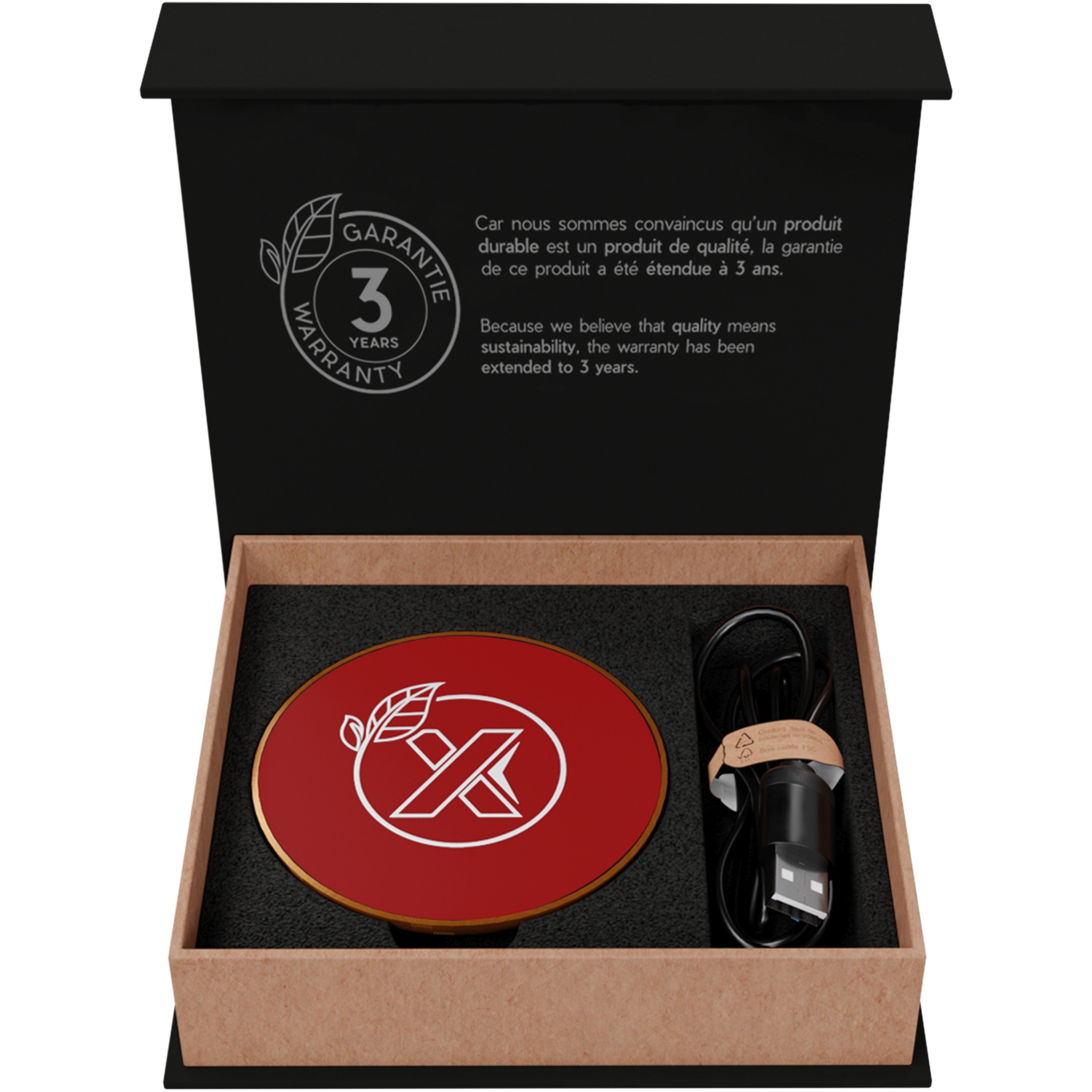 10W wireless charging station made of rubber and wood, and a charging cable made of recycled PET plastic. Can be decorated with a light-up logo. Delivered in a black kraft gift box made of recycled paper with magnetic closing mechanism. Patent EUROPE EUIPO.