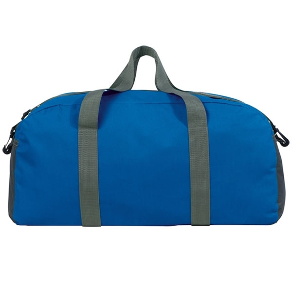 Large 600D polyester sports bag with large inner compartment, carrying handles, and adjustable shoulder strap. We print your logo on one side.