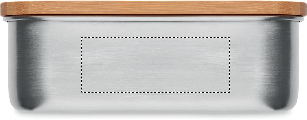 Stainless Steel lunch box with bamboo lid and 2 cutlery utensils with attachable polyester band. Capacity 600ml. Bamboo is a natural product, there may be slight variations in colour and size per item, which can affect the final decoration outcome.