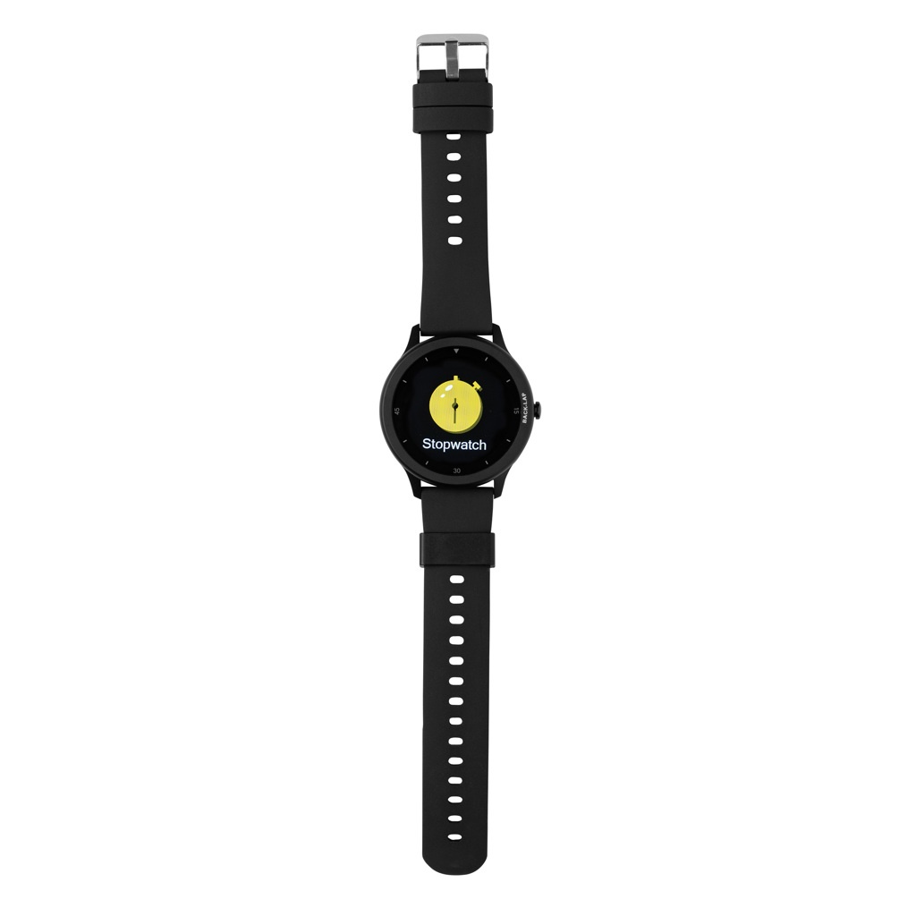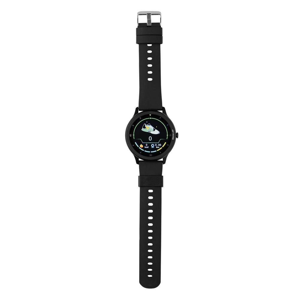 Modern high performance watch with 1.28" round fast responsive full touch screen to track your activities all day long. With high resolution display. Made with RCS (Recycled Claim Standard) certified recycled TPU armband and zinc alloy frame. Total recycled content: 23% based on total item weight. RCS certification ensures a completely certified supply chain of the recycled materials. Features include: Step count, calories, distance, multi-sport (24 types) tracking alarm clock, heart rate tracking, blood pressure monitoring, sleep monitor calendar updates. Notifications: SMS, Facebook, Skype, WhatsApp, Twitter etc. Compatible with Android 4.4 and IOS 8.0 and above. IPX 68 water and dustproof. BT 5.0. Standby time of 25 days and working time up to 7 days. Including clip charger to charge the watch. Packed in FSC® mix kraft packaging. Item and accessories 100% PVC free.