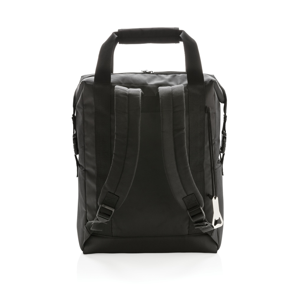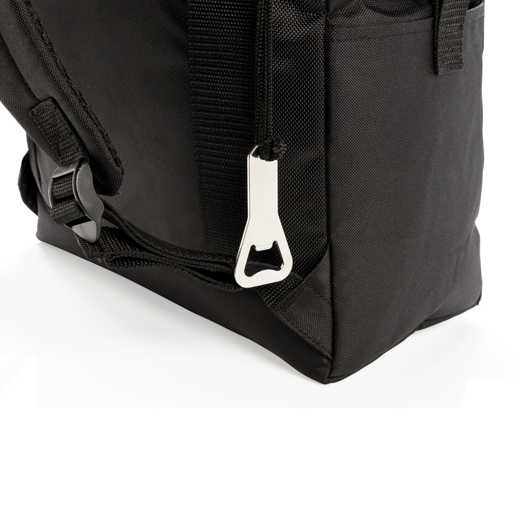Deluxe 1680D and 600D polyester cooler totepack with extra-large zipped main compartment and zipped front pocket. Large storage space. Double reinforced carrying handles. Including bottle opener. Fits up to 28 cans. PEVA insulation.