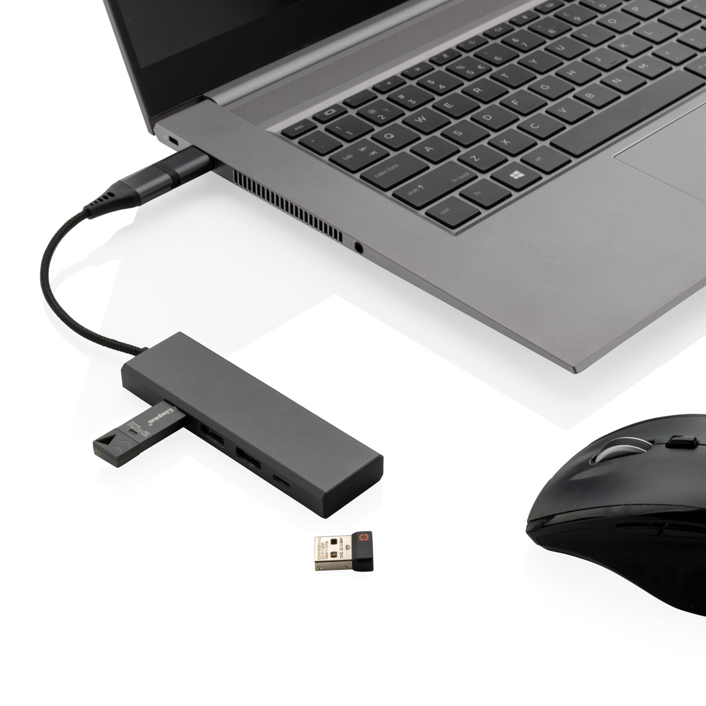 Aluminium USB hub made with RCS (Recycled Claim Standard) certified recycled aluminium, ABS, TPE and PET. With 3 USB A 2.0 ports and 1 type C port. The HUB has an integrated 10 cm cable made from recycled RCS certified TPE/PET material. Total recycled content: 75% based on total item weight. RCS certification ensures a completely certified supply chain of the recycled materials. With dual input connector so it is suitable for both type C and USB A computers. Aluminium does not lose its characteristics in the recycling process and can be recycled endlessly. Item and accessories 100% PVC free. Packed in FSC mix packaging.