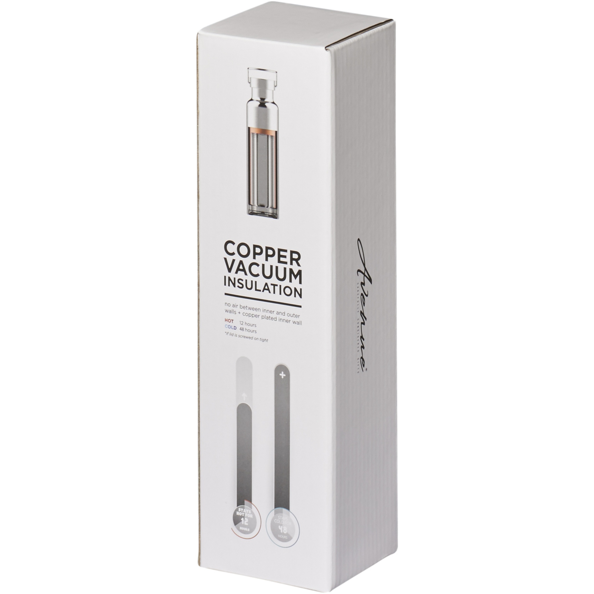 Durable, double wall stainless steel vacuum construction with copper insulation, which allows your beverage to stay cold for 48 hours and at least 12 hours for hot beverages. The construction also prevents condensation on the outside of the bottle. On-trend, durable powder coating. Stainless steel screw-on spill resistant lid with durable stainless steel hand loop. Wide opening for comfortable filling and pouring. Perfect for ice cubes. Volume capacity is 650ml. Presented in an Avenue gift box.