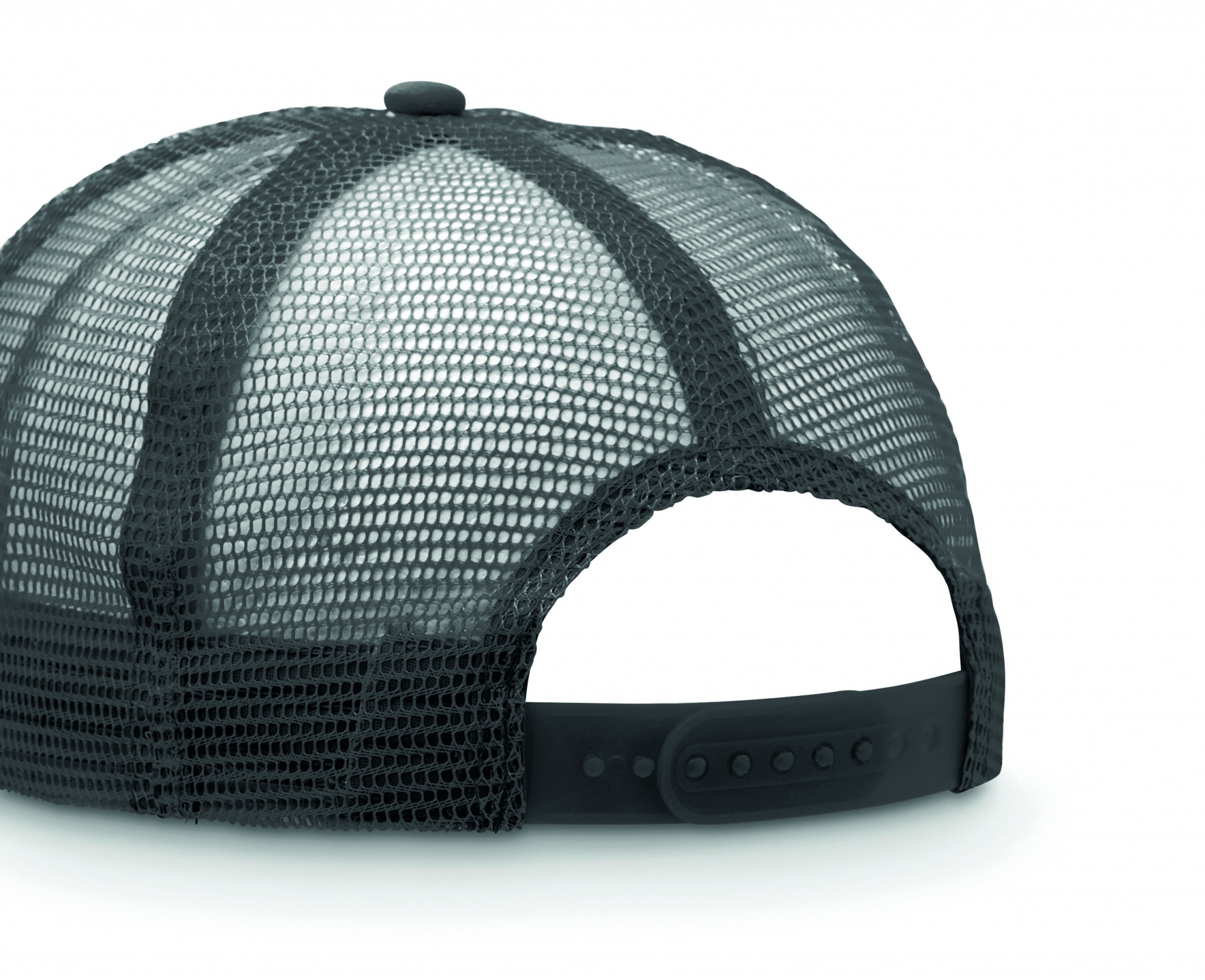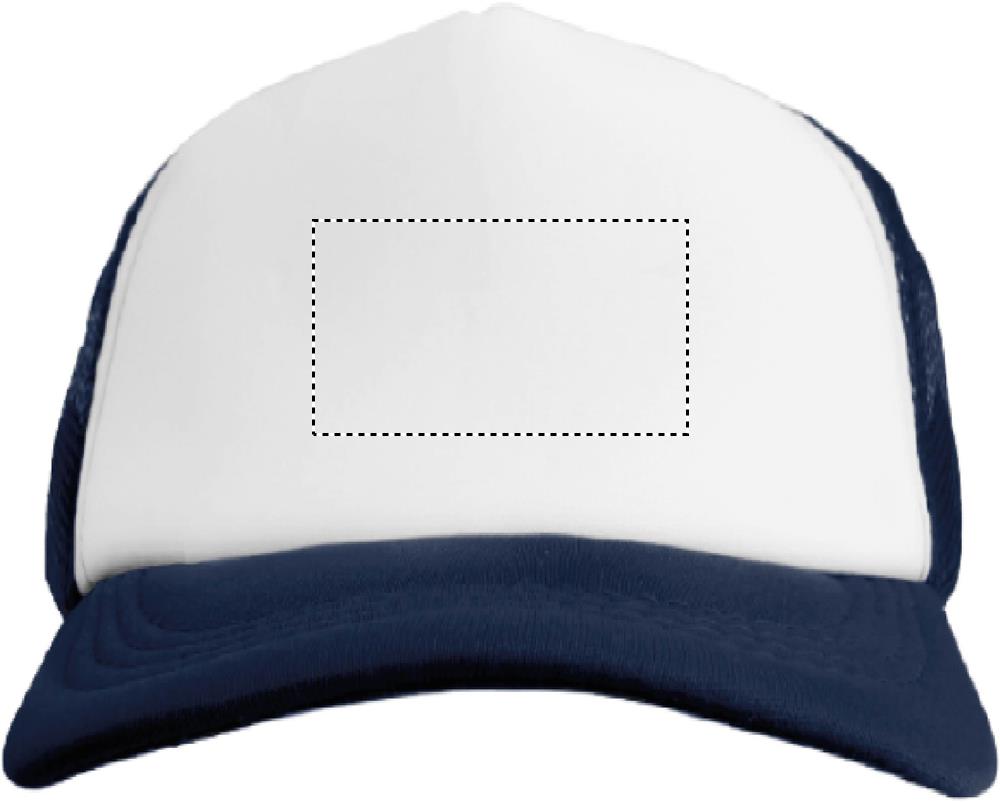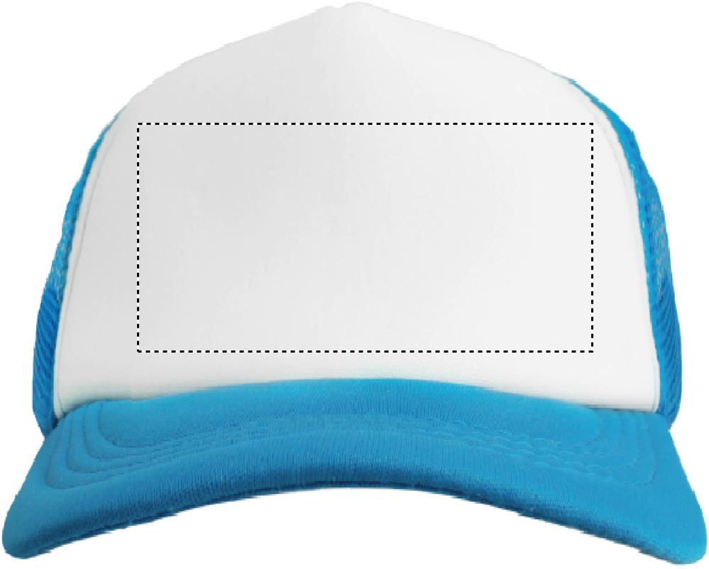 5 panel truckers cap in polyester 140-150 gr/m2 with adjustment plastic snap closure. White front panel and color visor in polyester jersey with foam backing. Other panels in color mesh. Size 7 1/4.
