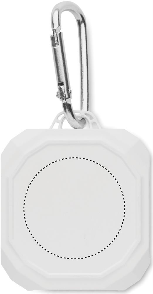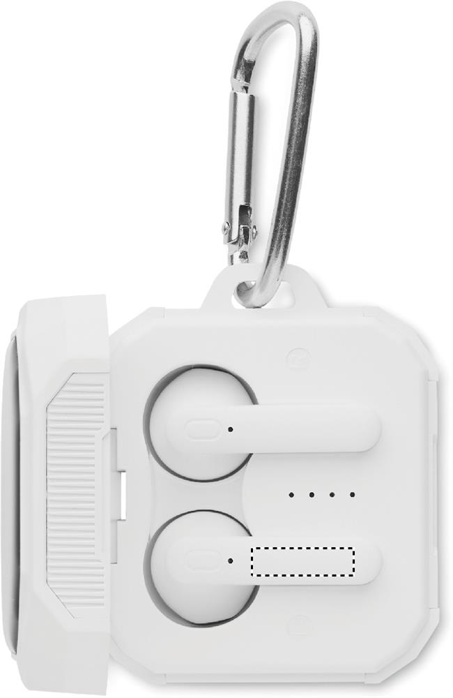 ABS True Wireless Stereo (TWS) 5.3 wireless earbuds with microphone and carabiner. 30 mAh battery. Playing time approx. 4 hours. It has a solar charging battery. Auto-pairing. Including a Type C charging cable and a 200 mAh charging station.