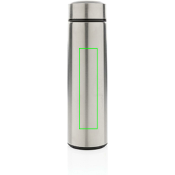 Keep coffee or tea nice and toasty in this vacuum stainless bottle with brushed metal lid. The bottle features a leak-proof screw lid and allows for drinking from any side. The wide mouth opening allows for easy cleaning. Capacity 450ml. BPA free.