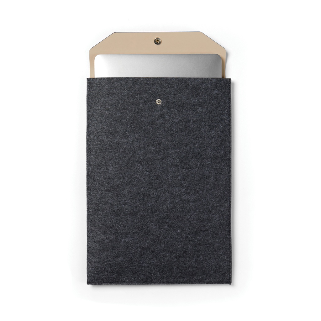 Laptop sleeve designed with a sleek, clean aesthetic using GRS recycled felt with a mélange effect. This sleeve effectively protects your computer from bumps and moisture. It features a PU flap opening for easy access and added elegance. The inner dimensions of this case are 34x2.5x24 cm, making it suitable for computers with an overall size of 15 inches. Please note that the dimensions of the display are not the same as the dimensions of the entire computer. Certified by GRS (Global Recycled Standard), GRS certification guarantees that the entire supply chain of the recycled materials is certified. The total recycled content is based on the overall product weight. This product contains 82% GRS recycled felt.Suitable for computers with an overall size of 15 inches. Please note that the dimensions of the display are not the same as the dimensions of the entire computer.