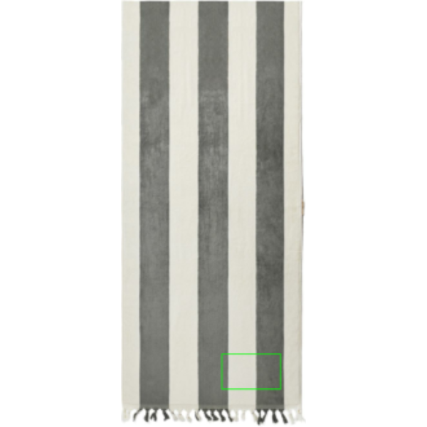 A luxurious cotton beach towel, with tassels at one short end and a lounge chair pocket at the other. Slide the pocket over the lounge chair to keep the towel in place. Our beach towels are made in India with cotton, and have a thickness of 450 g/m2. OEKO-TEX® STANDARD 100. 09.HIN.68091. Hohenstein HTTI.
