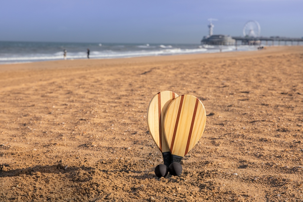 Luxury eye catching frescobol set to play on the beach, park or on your holiday. Made from strong and lasting Pine wood mixed with Sapele wood for which the wood pattern can be different per racket. Including two high quality balls. With extra comfortable grip for perfect control. Including cotton pouch to bring the set to your favourite beach or park.