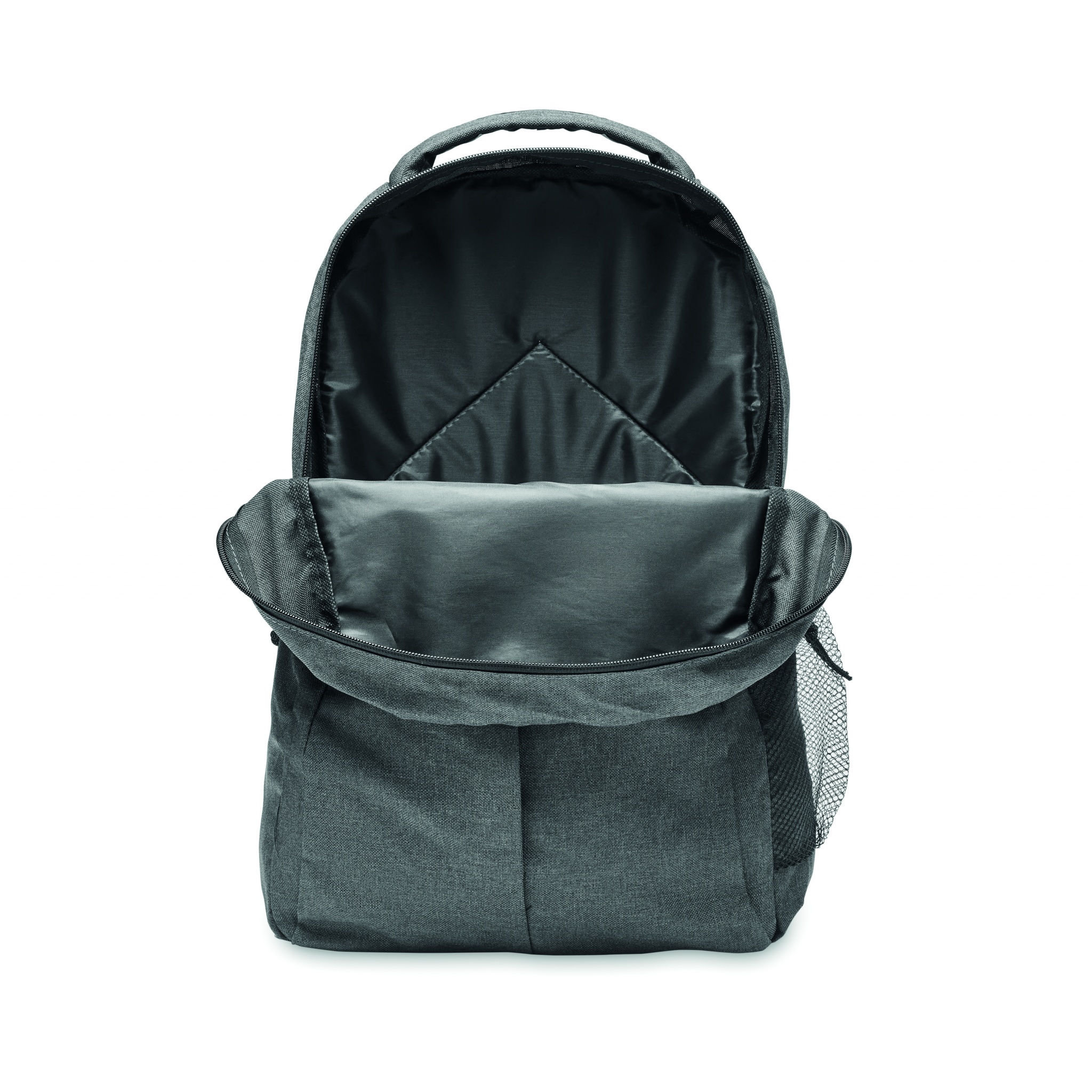 Seljakott 600D RPET 2 tooni polüestrist lukuga välistasku ja küljes võrktaskuga.