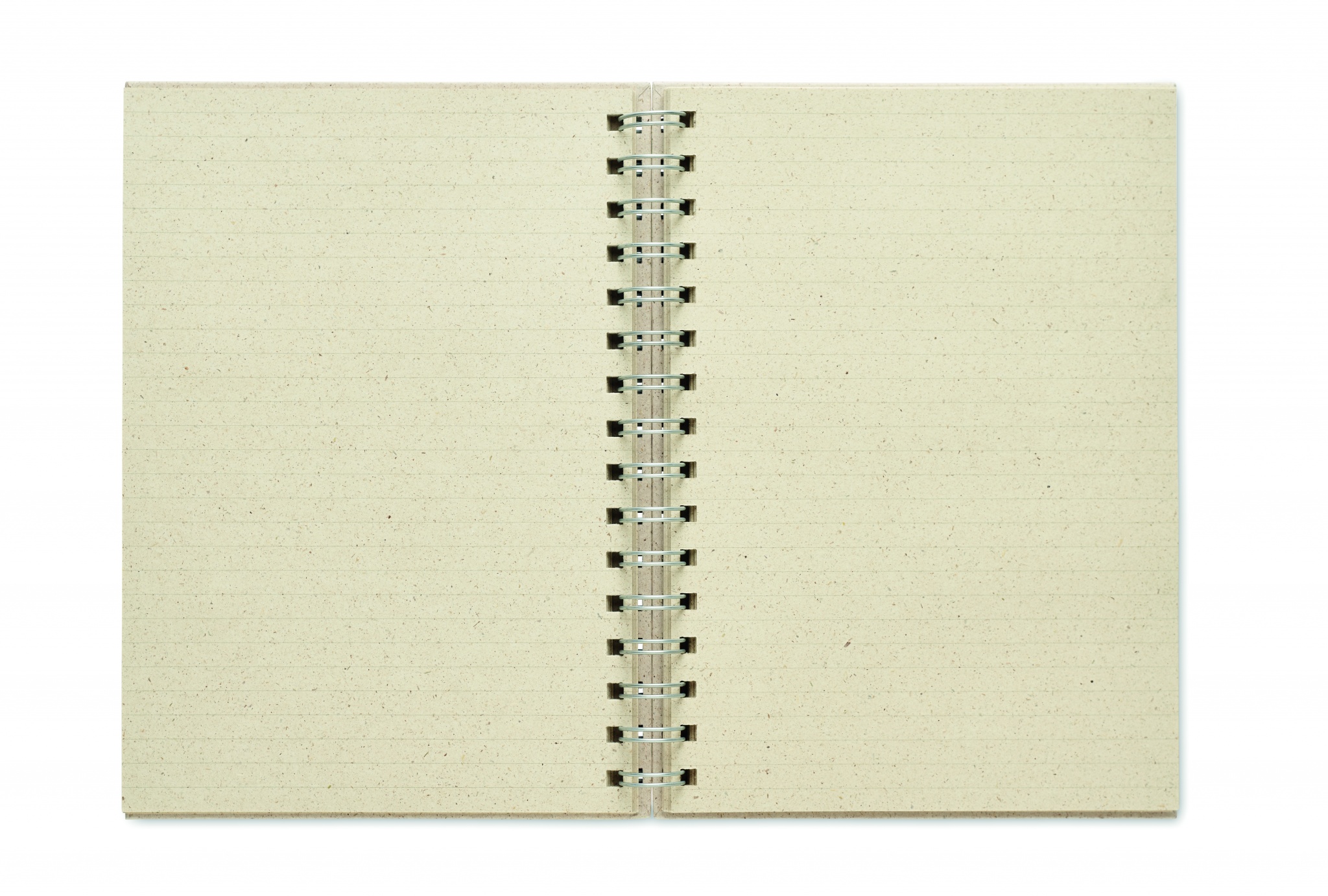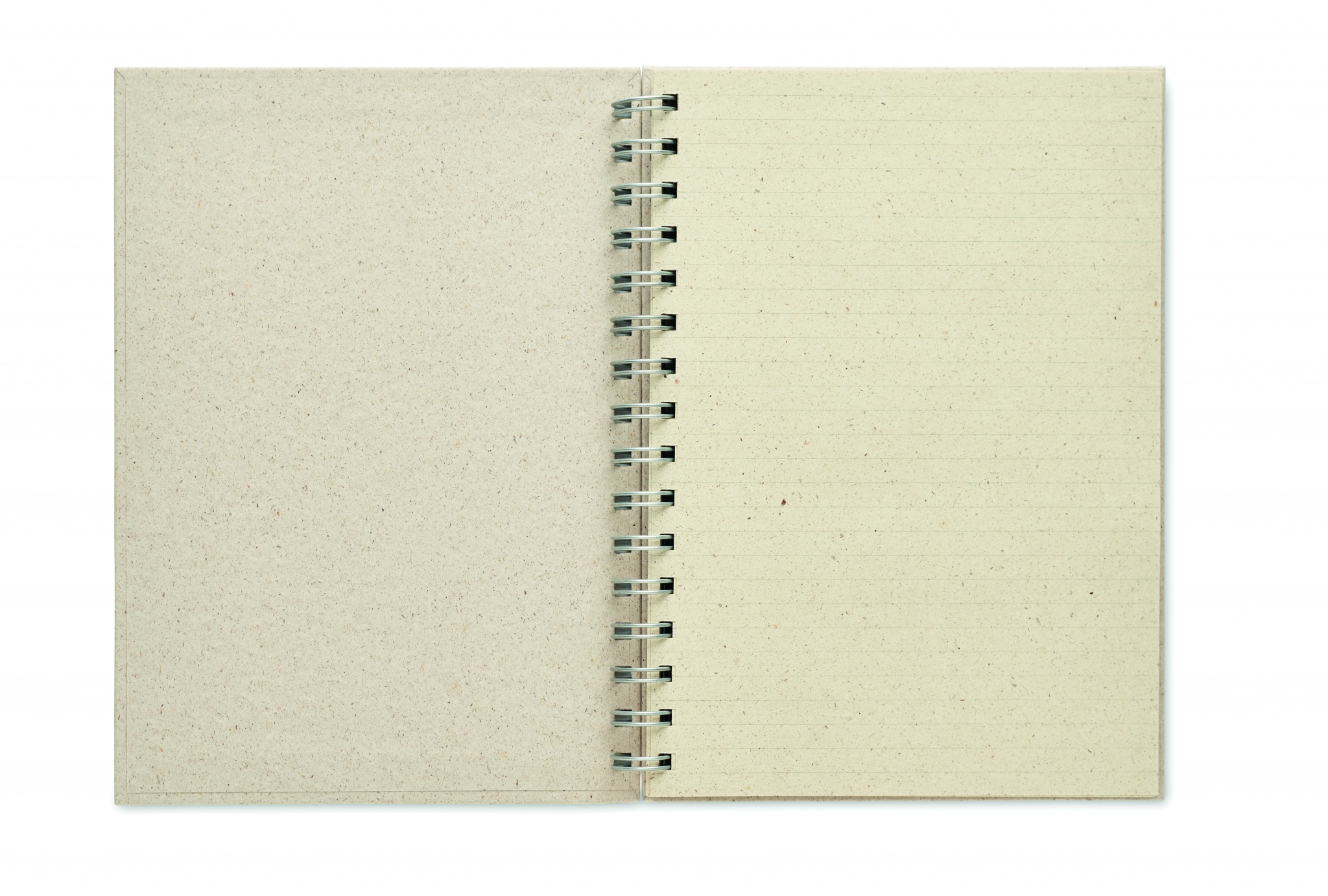 A5 murupaberist märkmik. Murupaberist kõva kate. Kahejuhtmeline. 160 joonega murupaberilehte (80 lehte). 95 gsm paber. 40% murukiude sisaldav murupaber.