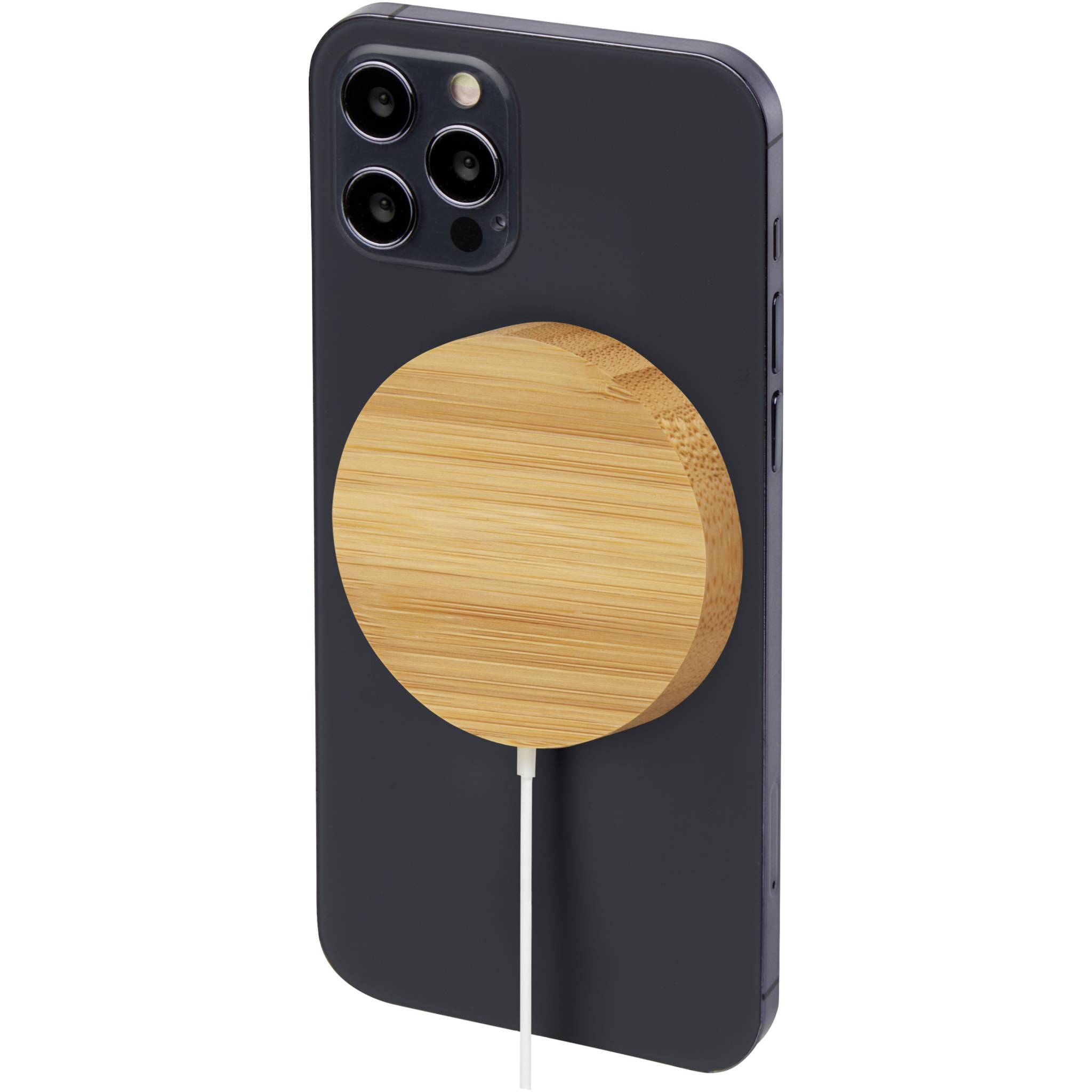 Juhtmeta magnetiline bambusest laadimispadi, mille saab seadme laadimiseks kinnitada telefoni (iPhone 12/iPhone 12 Pro /iPhone 12 Pro MAX) tagaküljele. 10 W juhtmevaba laadija ühildub kõigi Qi seadmetega (iPhone 8 või uuem ja Android seadmed, mis toetavad juhtmevaba laadimist) ning teiste telefonide puhul saab seda kasutada tavalise juhtmevaba laadimisalusena. Kaasas täiendav kahekordse teibiga metallrõngas, mis muudab eseme ühilduvaks kõigi teiste nutitelefonidega, millel on juhtmevaba laadimise võimalus. Tarnitakse kinkekarbis koos kasutusjuhendiga (mõlemad säästvast materjalist).