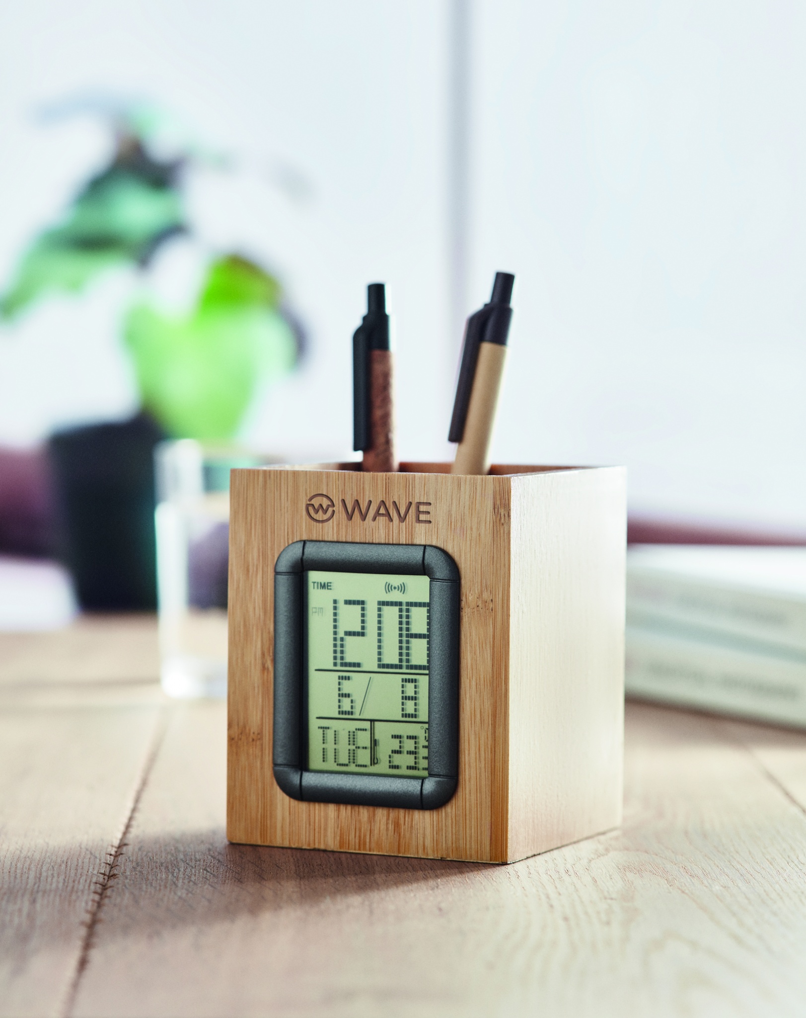 Logo trade ärikingi pilt: Bambusest pliiatsihoidja ja LCD kell