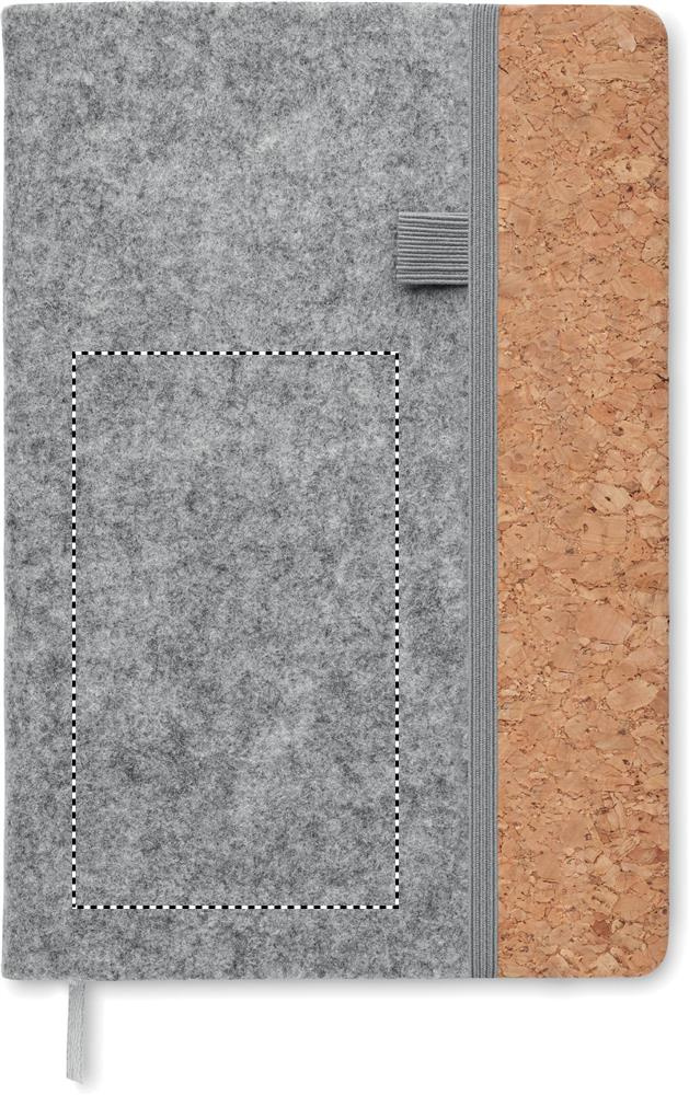 A5 märkmik RPET viltkatte ja korgiga. 160 taaskasutatud paberist joonitud lehte (80 lehte). Eest elastne pliiatsiaas, kokkusobiv elastne sulgurihm ja lehemarker.
