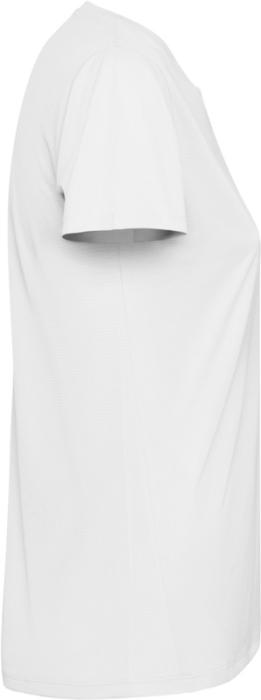 Lühikeste varrukatega liibuv tehniline t-särk naistele. Sobivate õmblustega krae. Tagumine alläär veidi pikem kui eest. Küljeõmblused nihutatud ettepoole.