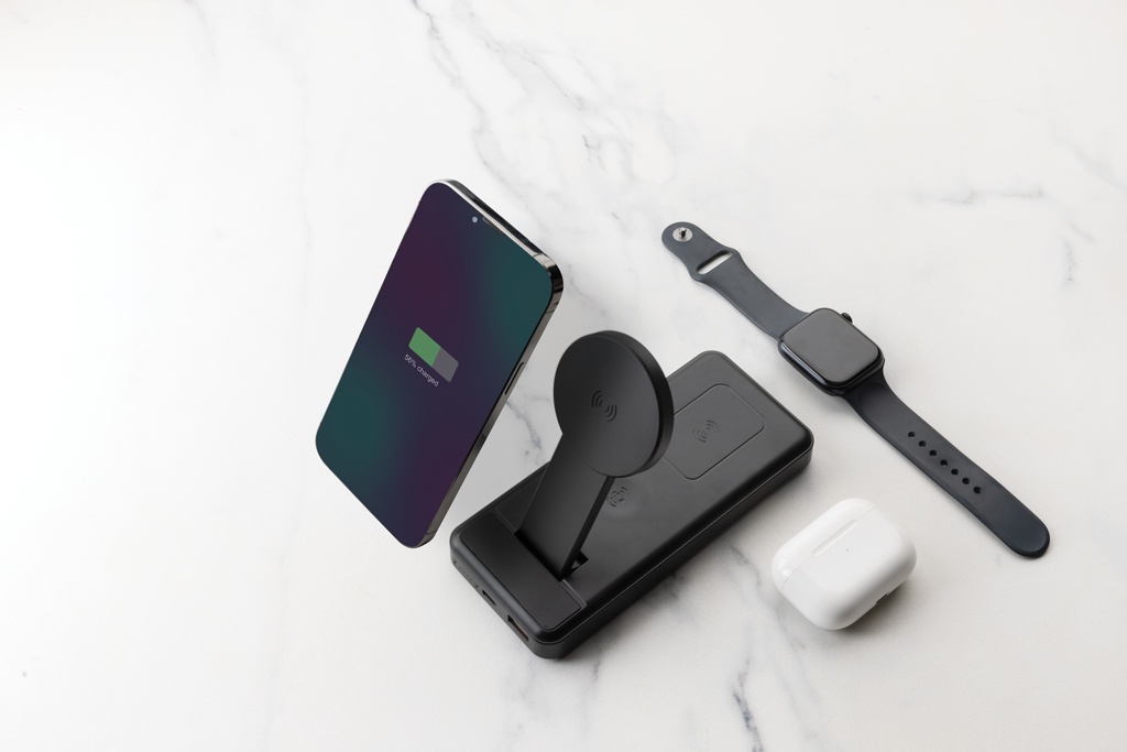 Unikaalne kolm ühes disainiga 10 000 mAh 15 W aku, mille korpus on valmistatud RCS-sertifikaadiga taaskasutatud ABS-plastist. RCS (Recycled Claim Standard) on standard toote ringlussevõetud sisu kontrollimiseks kogu tarneahelas. Taaskasutatud kogusisaldus: 22% eseme kogukaalust. Toitepank sisaldab kauakestvat A-klassi 10 000 mAh liitiumpolümeerakut. Toitepangal on kokkupandav integreeritud 15 W magnetiline juhtmevaba laadimisalus ja 5 W sekundaarne juhtmevaba laadija, mida saab kasutada väiksemate juhtmevabade esemete jaoks, nagu kõrvaklappide ümbrised ja kolmas 2,5 W kellalaadija IOS-kellade jaoks. Toiteindikaatorid näitavad järelejäänud energiataset, nii et teate alati, millal laadida. esemed ja tarvikud PVC vaba. Kaasa arvatud RCS-sertifikaadiga taaskasutatud TPE laadimiskaabel. Pakitud FSC® segupakendisse. C-tüüpi sisend 5V2.5A 9V2A 12V1.5A; C-tüüpi väljund: 5V3A 9V2.22A 12V1.67A; USB-A väljund: 5V3A 9V2A 12V1.5A 5V4.5A