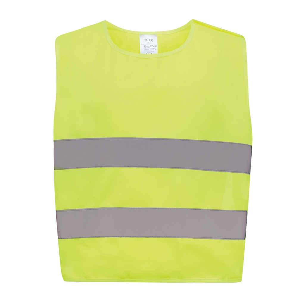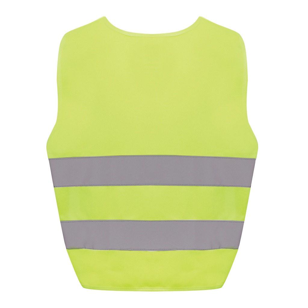 XS-suuruses hästi nähtav vest, mis on mõeldud 3-6-aastastele lastele, pikkusega 90-140 cm. Sellel vestil on ruumi kaunistamiseks nii esi- kui ka tagaküljel. See on varustatud konksu ja aasa sulguritega õlgadel ja allosas, et suurendada ohutust ja hõlpsasti selga panna. Elastsed ribad vastasküljel pakuvad paindlikkust, võimaldades seda mugavalt kanda paksude mantlite peal. Seda vesti on rangelt testitud ja see vastab EN 17353:2020 tüübile AB3. Lisaks järgib see määruses (EL) 2016/425 II kategooria isikukaitsevahendite kohta sätestatud isikukaitsevahendite juhiseid. Valmistatud GRS-sertifikaadiga taaskasutatud PET-st. Taaskasutatud kogusisaldus: 55% eseme kogukaalust. GRS-sertifikaat tagab taaskasutatud materjalide täielikult sertifitseeritud tarneahela.