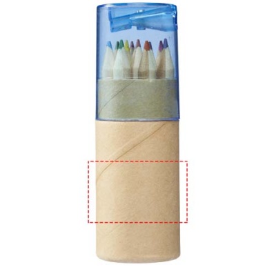 12 värvilist pliiatsit papp-silindriga karbis koos teritajaga plastkaanes. Dekoratsioon pole komponentidel saadaval.