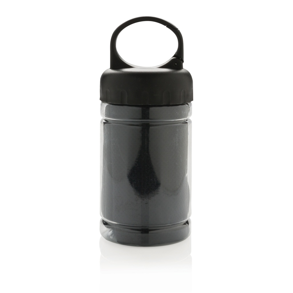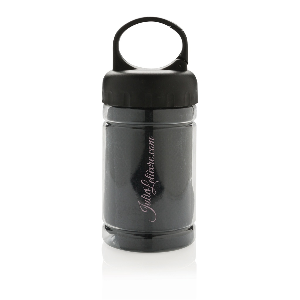 Mikrokiust jahutusrätik 100% kemikaalidevaba. 98% päikesekaitse funktsioon kuni UV 50+ kaitseni. Rätikut saab hõlpsasti kasutada, lisades pudelisse veidi külma vett, luues jaheda rätiku kiireks värskendamiseks. Pudel on valmistatud PP-st, millel on ABS pealispind ja karabiin, mida saab õuetegevustes kaasa võtta. 77x30 cm.