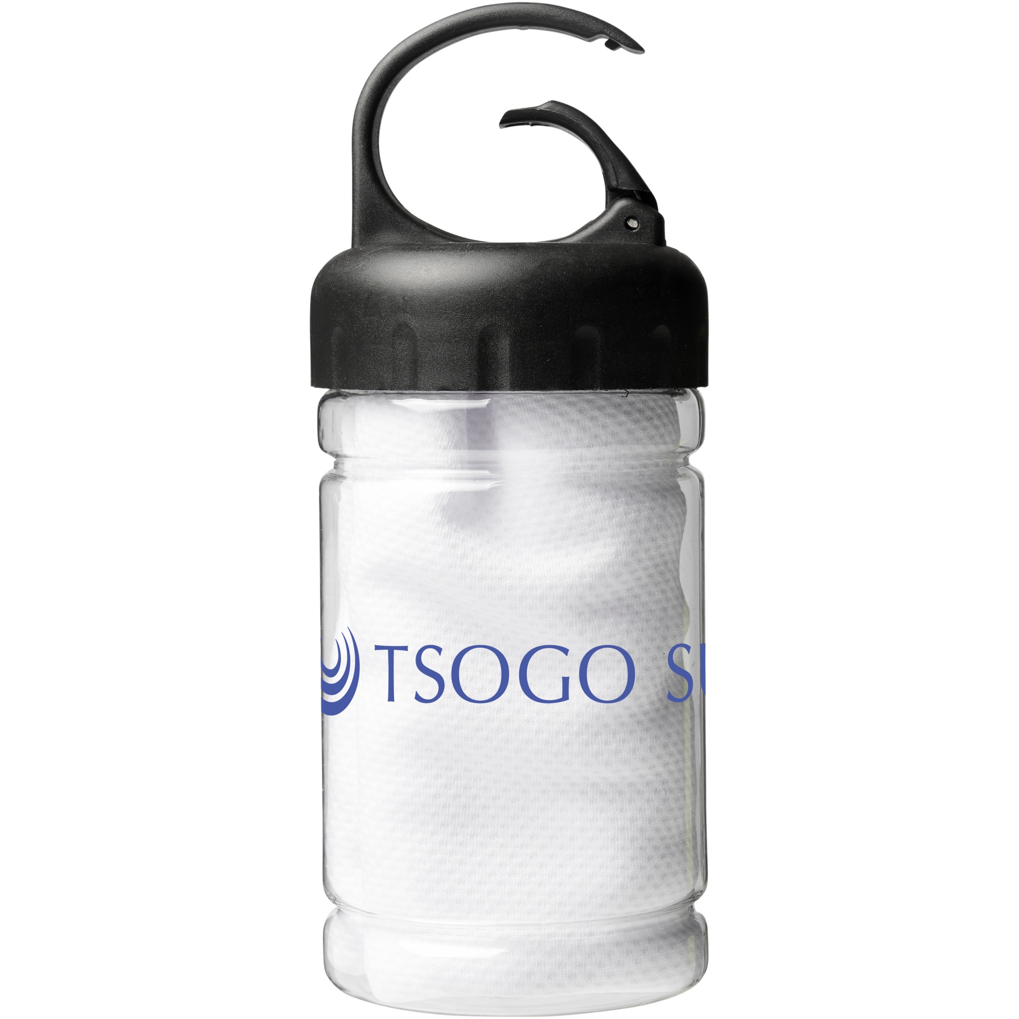 Tugevast ja vastupidavast polüestrist kiiresti imenduv, kiiresti kuivav ja pestav jahutusrätik, mis hoiab jahedana treeningu või välistegevuse ajal. Kaasas PET-konteiner, mille kandesangaga on lihtne kaasas kanda sisseehitatud karabiin. Saadaval 5 värsket värvi. Mahutil suur kaunistuse logoala, kaunistus võimalik ka jahutusrätikul endal. Mõõdud: 30 x 80 cm.