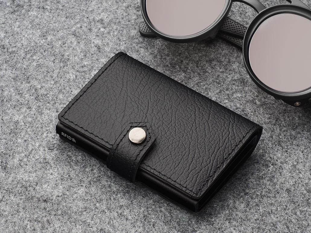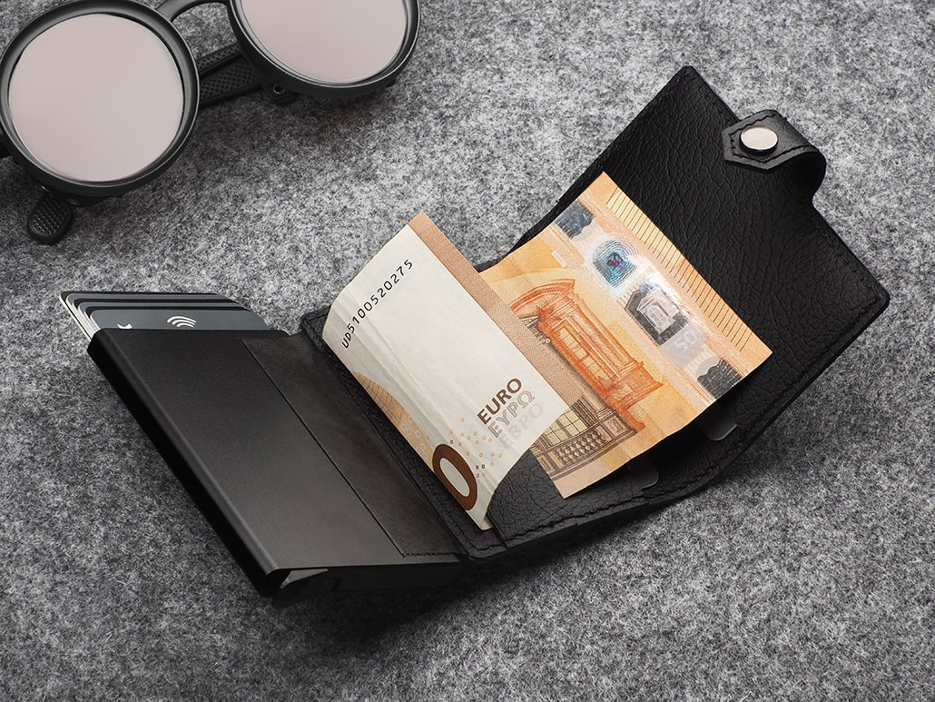 Mahutab 8 kaarti. RFID-turvaelement. Klõpsuga kinnis. Ilusas kartongis kinkekarbis. Logo graveeritakse või trükitakse kaardihoidjale.