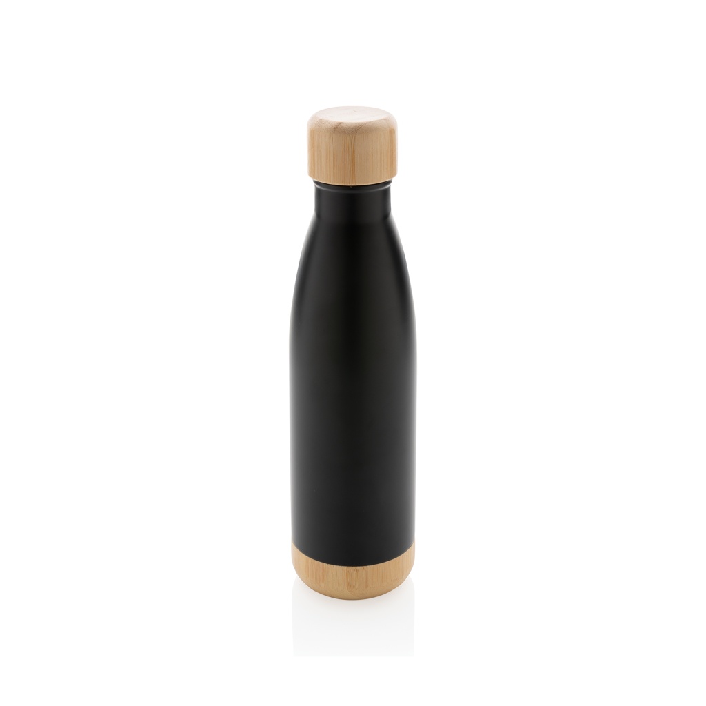 Roostevabast terasest vaakumpudel bambusest kaane ja põhjaga, must