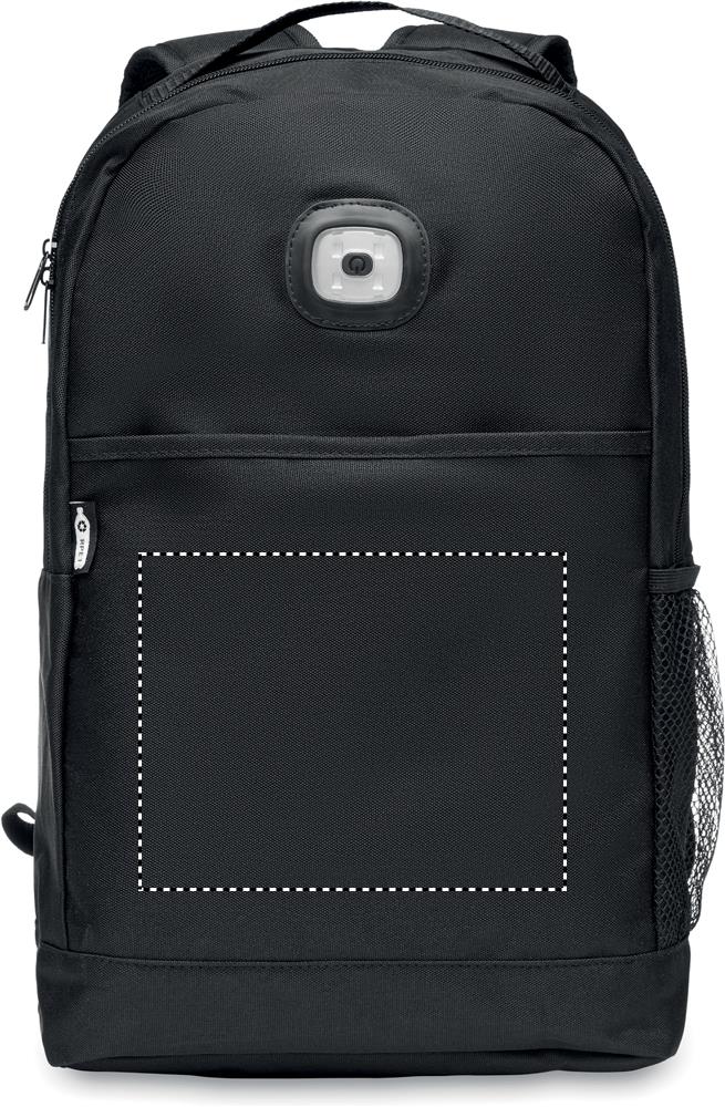 600D RPET-ist seljakott, mille esipaneelil on eemaldatav COB-valgusti. Valge COB-valgusti 3 erineva valguse heleduse seadistusega. Haagi ja aasaga suletav esitasku. Küljel võrktasku. Komplektis nööpatarei.
