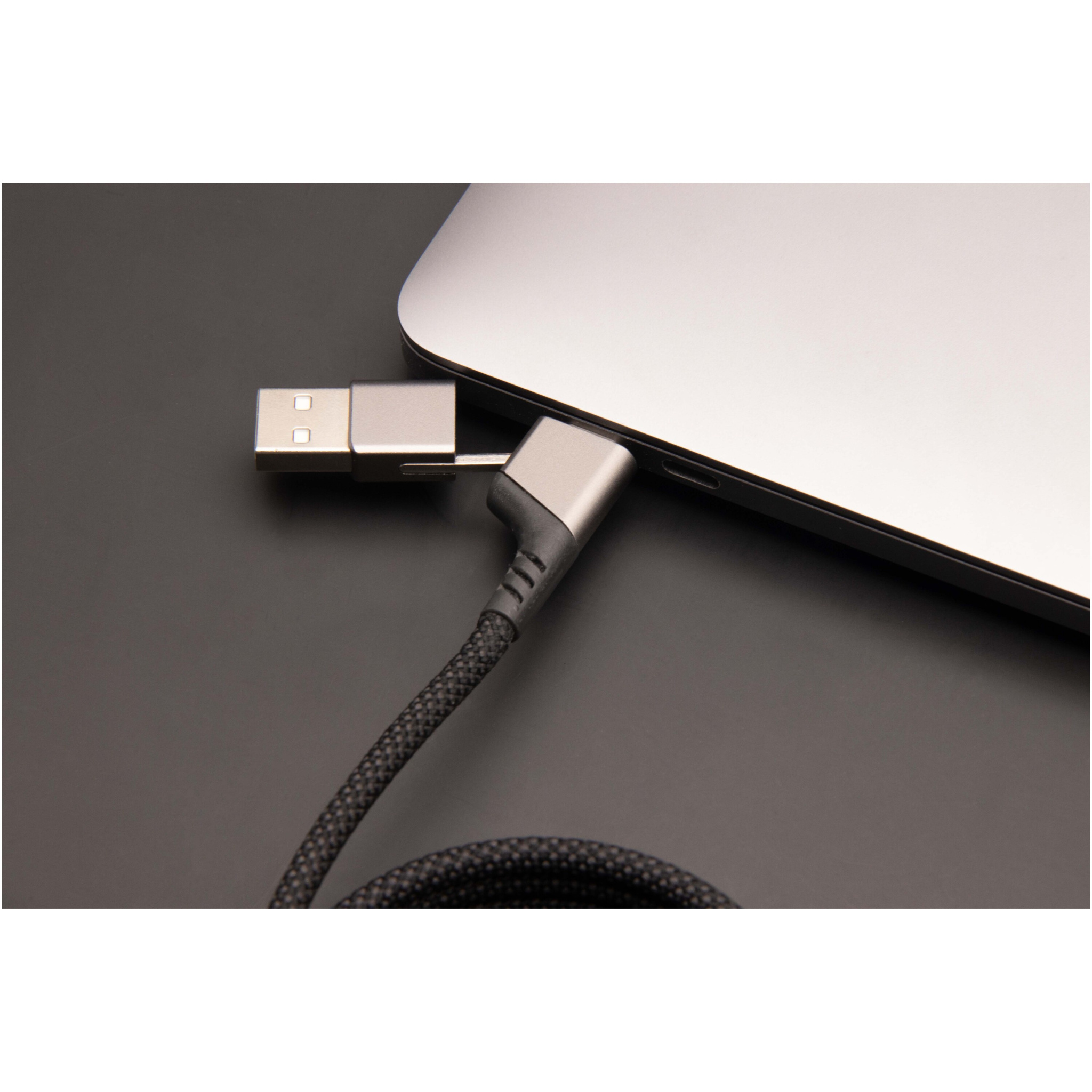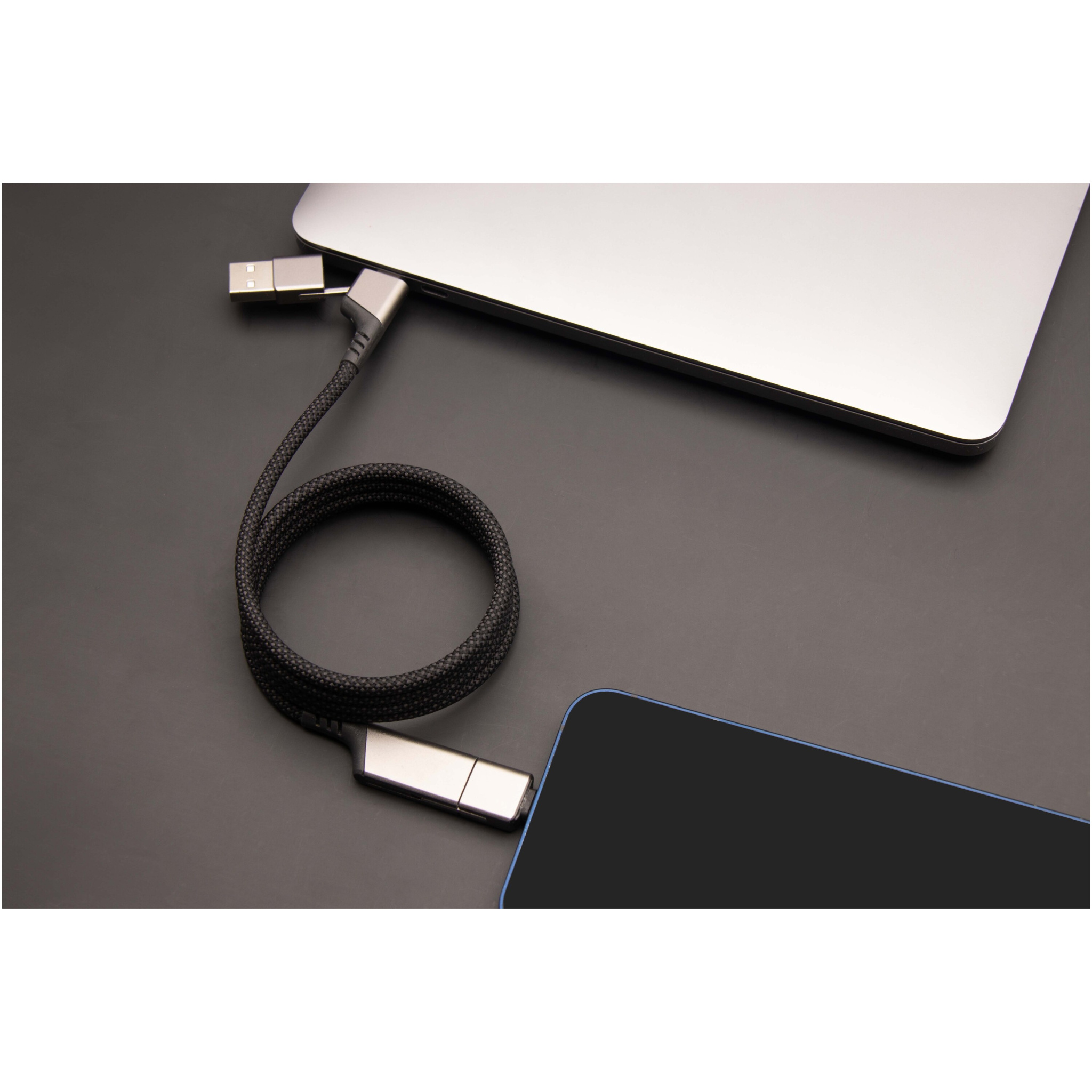 4-ühes ülikiire rPET 100 W ülikiire magnetiline laadimiskaabel, millega saab laadida nutitelefone, tahvel- ja sülearvuteid. Kahekordne USB-A + USB-C sisend muudab kaabli 100% ühilduvaks uusimate arvutimudelitega. Väljund: C-tüüp ja Lightning. CarPlayga ühilduv. Tarnitakse taaskasutatava TPU koti ja taaskasutatud paberist vahetükiga. Kaabli pikkus: 1 meeter.