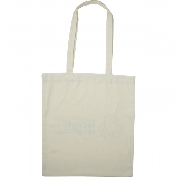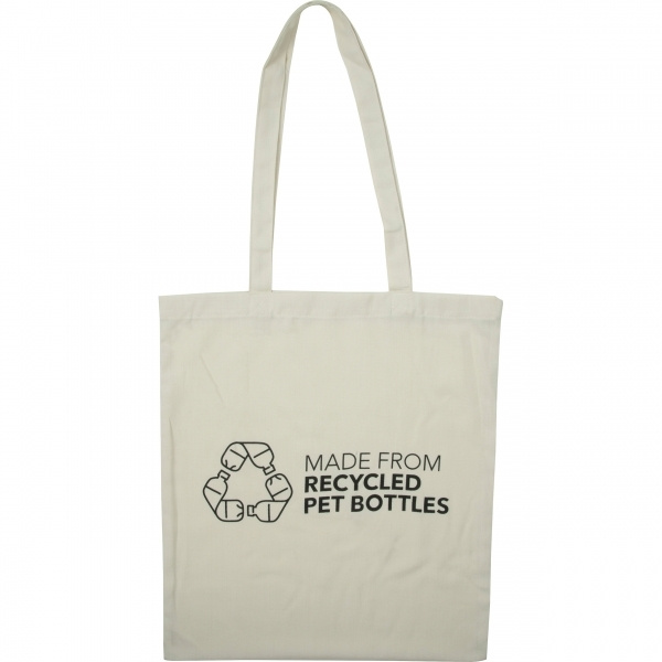 Naturaalne taaskasutatud RPET-materjalist korduvkasutatav kandekott, mille ühel küljel on trükitud logo `MADE FROM RECYCLED BOTTLES`. Teine pool pakub teie kohandatud kaubamärgi jaoks piisavalt ruumi. Keskkonnasõbralik, vastupidav ja ideaalne reklaampind!