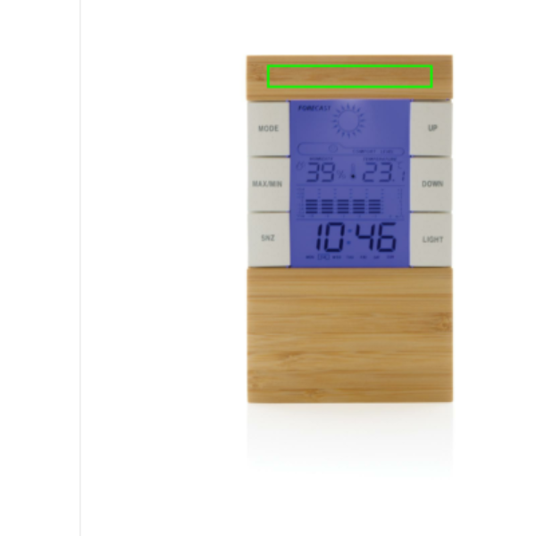 Ilmajaam on valmistatud RCS (Recycled Claim Standard) sertifitseeritud ringlussevõetud ABS-i ja FSC® 100% bambusest. Taaskasutatud kogusisaldus: 42% kauba kogukaalust. RCS-sertifikaat tagab taaskasutatud materjalide täielikult sertifitseeritud tarneahela. LCD ekraaniga. Funktsioonid: temperatuur, niiskus, kellaaeg, nädalapäev, kuupäev, temperatuur. Kaasa arvatud aaa patareid otseseks kasutamiseks. Pakitud FSC® mix kraft karpi.