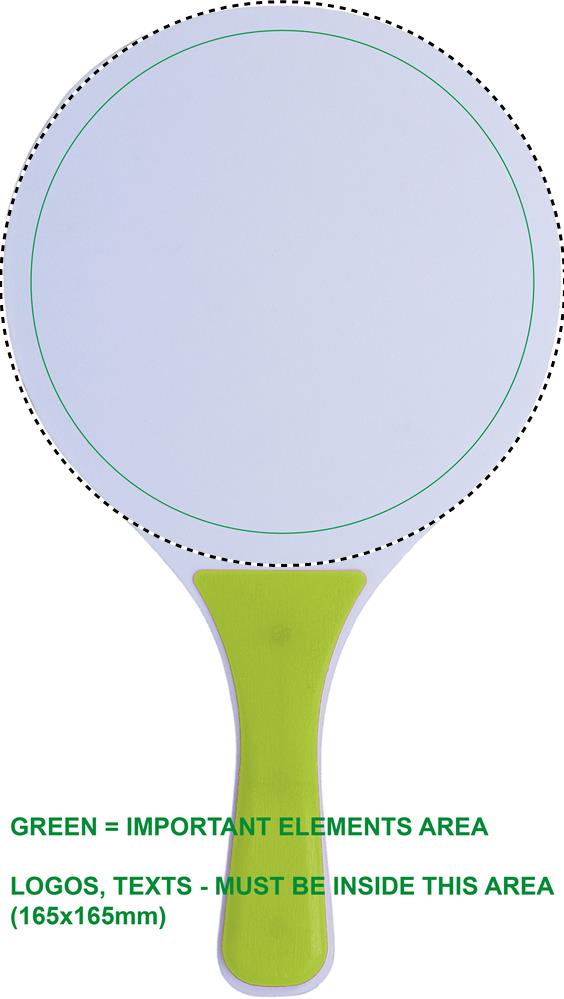 Väike rannatennise komplekt, mis koosneb 2 MDF reketist ja 1 pehmest pallist.