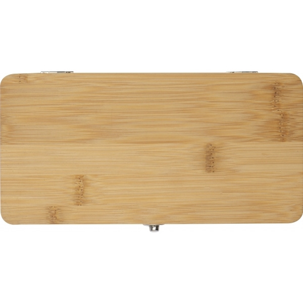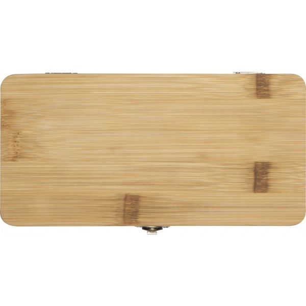 22-osainen työkalusarja, joka sisältää 3 ruuvimeisseliä, erilaisia teriä adapterineen sekä leikkurin ja 4 kuusikulmaista avainta bambukotelossa. Logosi kaiverretaan koteloon.