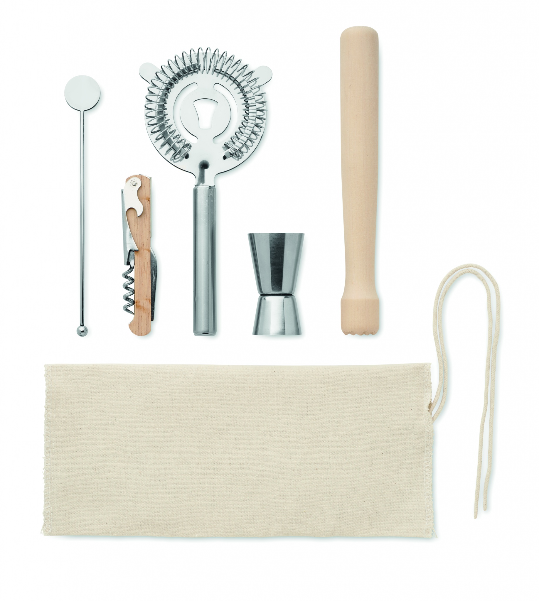 Cocktail-sarja puuvillapussissa, jossa nyörikiinnitys. Sisältää 5 kpl: kaksipuolinen mittakuppi (15 & 30 ml), puinen sekoitin, cocktailsiivilä, juomasekoitin ja tarjoilijan korkkiruuvi. Pussi 220 g/m².