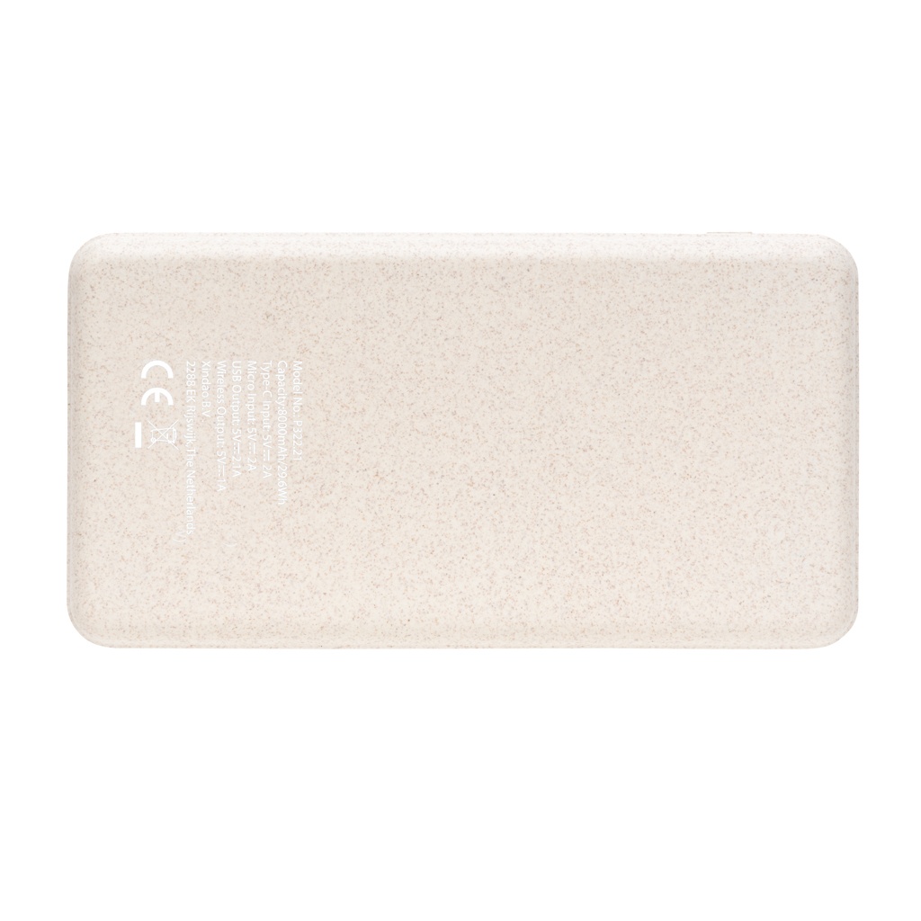 8000 mAh langaton varavirtalähde 5W langattomalla laturilla. Tuotteen yläpuoli on valmistettu luonnonkorkista ja kotelo 35% vehnänoljesta sekoitettuna ABS-muoviin. Sisääntulo on mahdollista sekä micro-USB:n että tyypin C kautta. Täyteenladatulla varavirtalähteellä voit ladata puhelimesi jopa neljä kertaa. Tuotteessa on kestävä A-luokan 8000mAh litiumpolymeeriakku. Tuotteessa oleva merkkivalo näyttää jäljellä olevan virran määrän, joten tiedät aina, milloin ladata varavirtalähde uudelleen. Langaton lataus toimii kaikkien QI-yhteensopivien laitteiden, kuten uusimpien Android puhelimien sekä uusimpien iPhone puhelimien (8 ja uudemmat), kanssa. Micro sisääntulo 5V/2A Tyyppi C sisääntulo 5V/2A USB Ulostulo 5V/2.1A. Langaton ulostulo 5W 5V/1A. Tuote ja lisätarvikkeet 100% PVC vapaita.