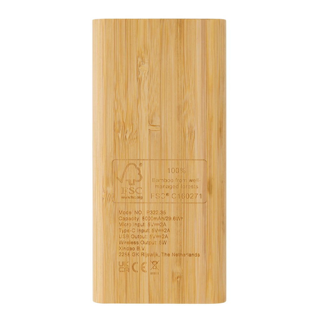 8000 mAh varavirtalähde, jonka kotelo on valmistettu 100% FSC-sertifioidusta bambusta. Varavirtalähteessä on pitkäkestoinen A-luokan 8000 mAh litiumpolymeeriakku. Varavirtalähteellä voi ladata 5W langattomasti tai kaapelilla. Virran merkkivalot kertovat paljonko virtaa on jäljellä, ja koska tuote tulee ladata uudelleen. Langaton lataus yhteensopiva Androidin uusimpien sukupolvien sekä iPhone 8 ja uudempien kanssa. Sisääntulo micro ja Tyyppi C, DC5V/2A; Ulostulo USB-A, micro USB ja Tyyppi C DC5V/2A; Sisältää PVC-vapaan TPE-materiaalista valmistetun latauskaapelin. Tuote ja lisätarvikkeet 100% PVC-vapaita. Pakattu FSC-sekoituksesta valmistettuun pakkaukseen.