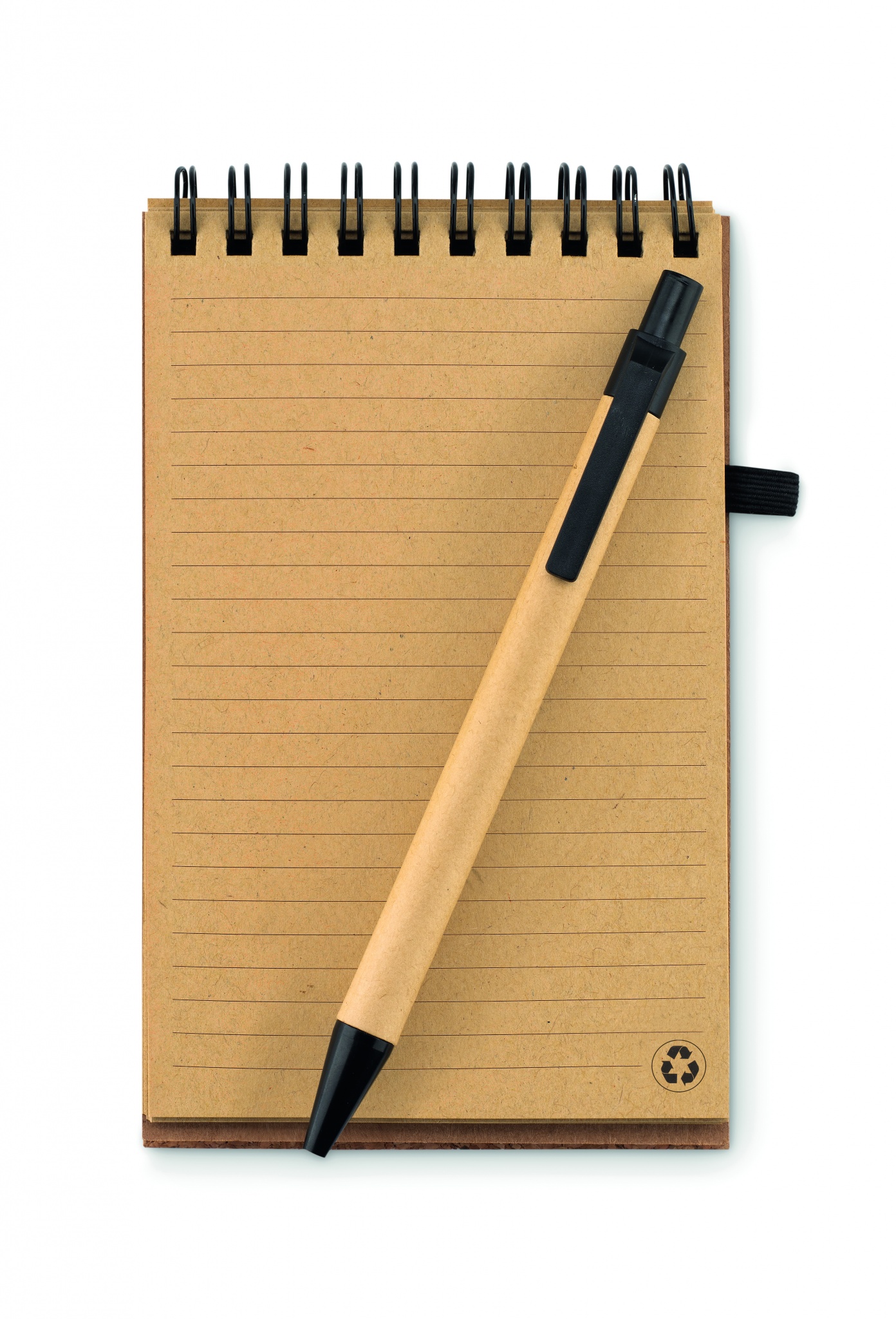 A6 korkki kantinen muistikirja, 70 viivoitettua sivua ja kierrätetty kuulakärkikynä mustalla musteella. Kynän runko on valmistettu kierrätetystä kartongista, yksityiskohdat valmistettu maissi PLA. Korkki on luonnonmateriaali, strukturaalinen laatu ja pinnan huokoisuus voi aiheuttaa eroavaisuuksia tuotteissa painatuksen jälkeen