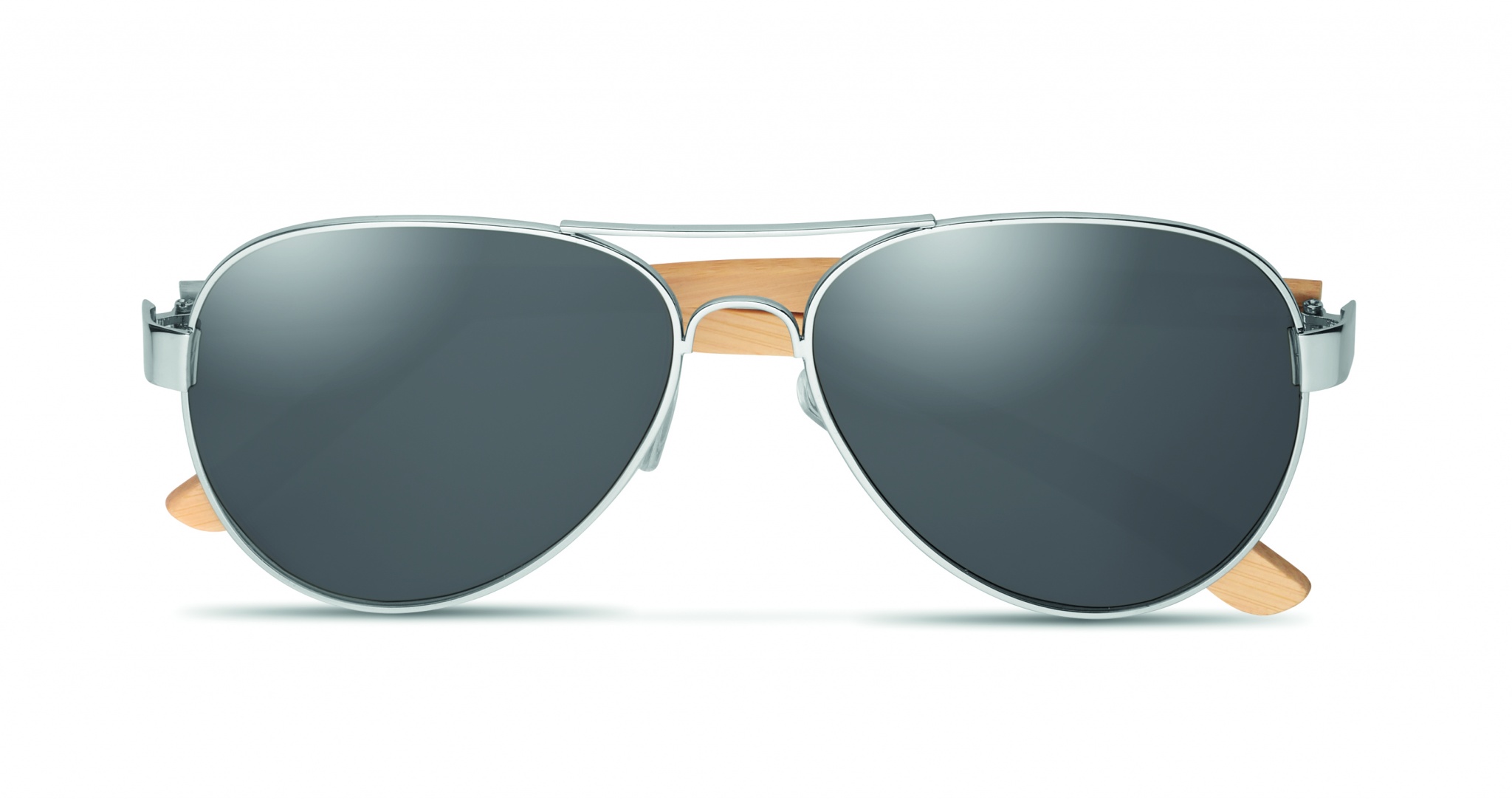 UV400 aurinkolasit bambu sangoilla ja peililinsseillä. Tuote toimitetaan mikrokuitu säilytyspussissa.