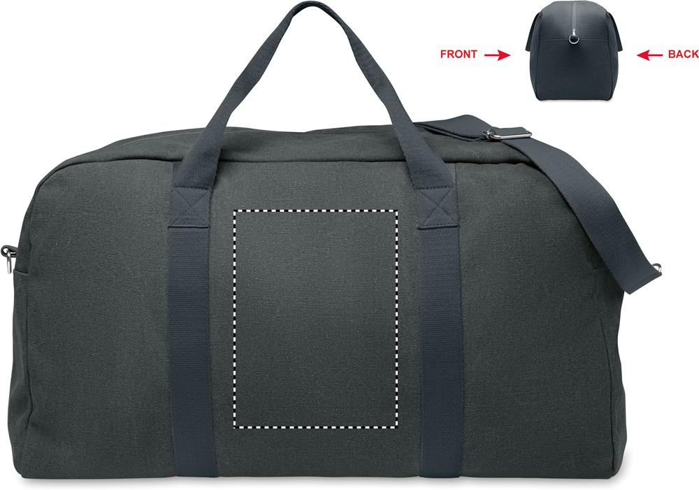 Duffelimatkalaukku kierrätysmateriaalista 450 gr/m² (60 % kierrätettyä puuvillaa ja 40 % kierrätettyä polyesteriä),laukussa on säädettävä ja irrotettava puuvillahihna.