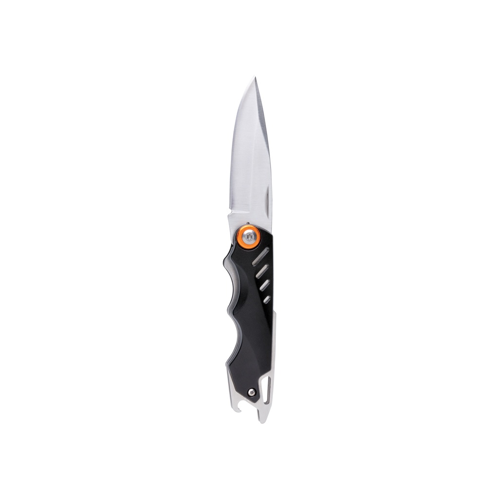 Huippukestävä veitsi, jossa 4 toimintoa. Pakattu ylelliseen lahjapakkaukseen, ml. huippulaatuinen 1680D-pussi. Alumiinirunko ja ruostumattomat terästyökalut. Työkaluihin kuuluvat: Sisään taitettava terä, terän lukitus, vyöklipsi, pullonavaaja.