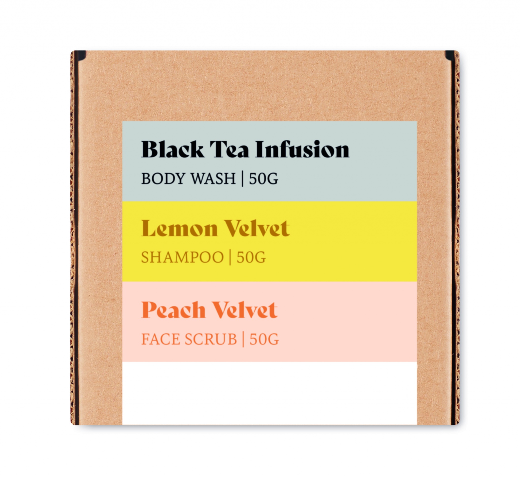 Branded By Earthin matkalahjasetti, sisältää 50 gr vegaanisen- vartalonpesuaineen, shampoon ja kasvojen kuorintaineen. Pakattuna kierrätettyyn paperirasiaan, valmistusmaa EU.