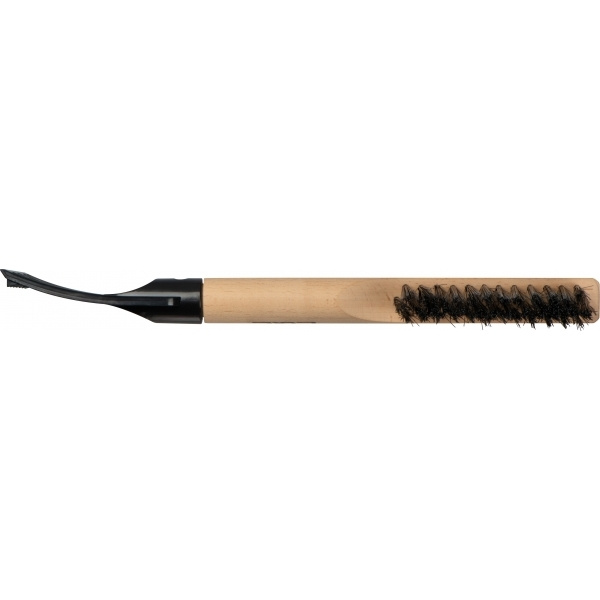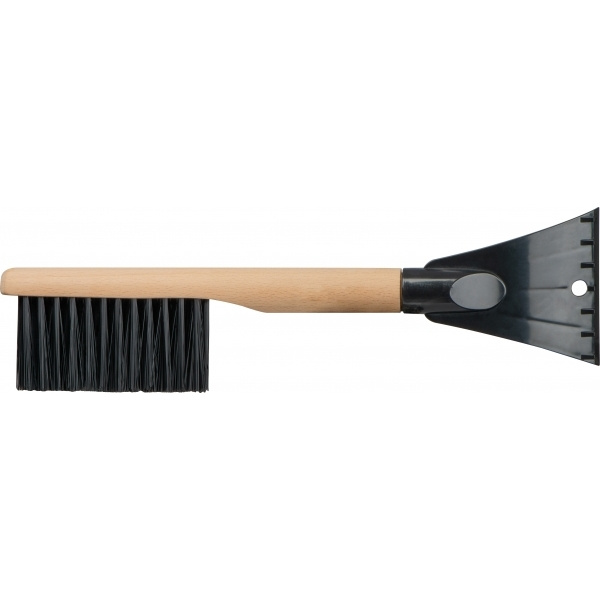 2-in-1 jääkaavin lumiharjalla. Siinä on puinen kahva, joka tarjoaa mukavan otteen myös kylmissä lämpötiloissa, ja ripustuslenkki jääkaapimessa.