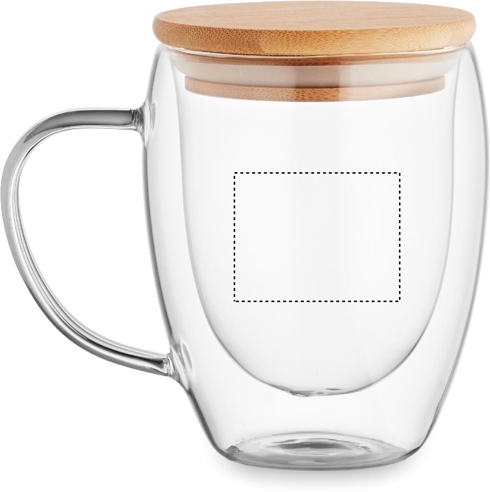 Kaksiseinäinen borosilikaattilasimuki kahvalla ja bambukannella. Tilavuus: 300 ml.