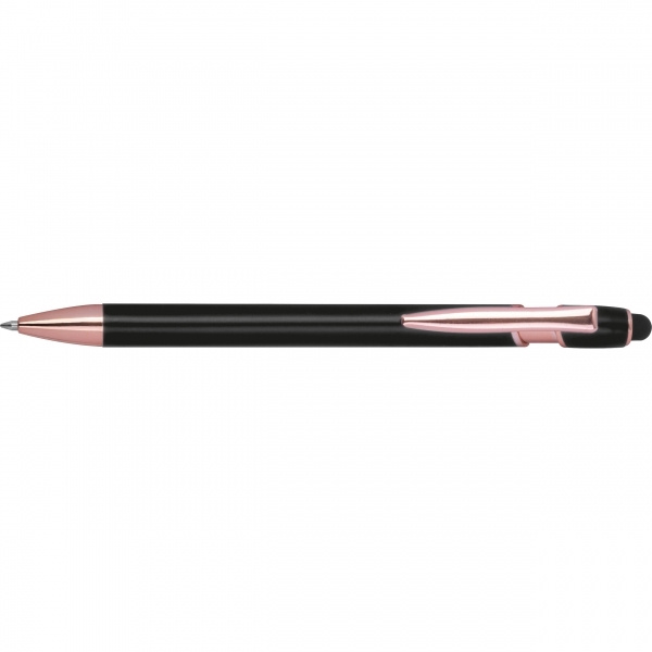 Kierrätetystä alumiinista valmistettu puoligeelikynä, jossa on kosketuskynä ja sinisellä kirjoitettava suurikapasiteettinen täyttöpakkaus (1 mm:n kärki). Logosi on kaiverrettu runkoon laserkaiverruksella.