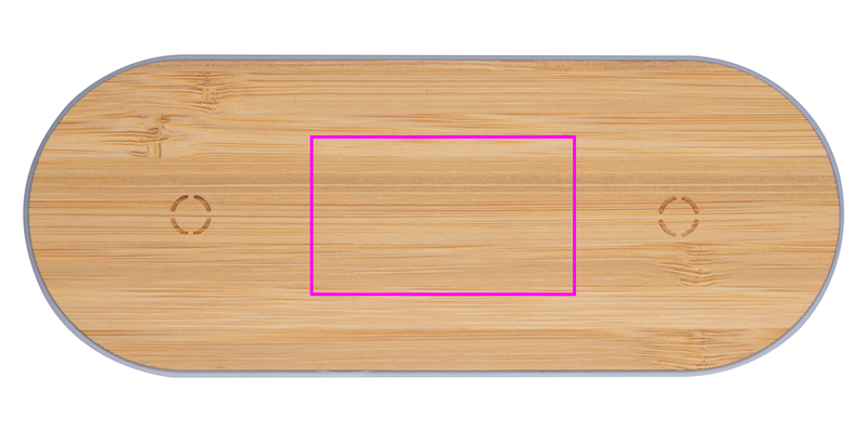 Ohut muovinen latausasema bambupinnalla ja kahdella induktiolatauspisteellä älypuhelimille, mukaan lukien latauskaapeli. Logosi kaiverretaan asemalle.