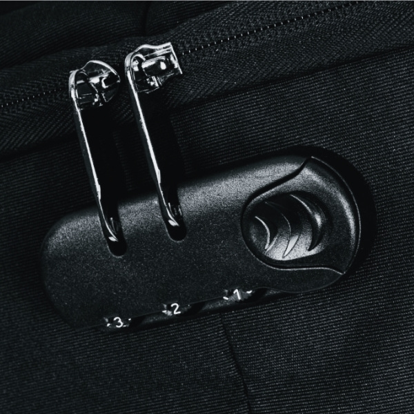 Turvareppu varkaudenestoominaisuuksilla. Sisäänkäynti repun pääalueelle on omaa laukkuasi päin, mikä vaikeuttaa jonkun muun pääsyä. Repussa on myös lukko vetoketjujen kiinnitystä varten sekä piilotasku maksukortille tai avaimille. Sisäosassa on pehmustettu tila 15 "kannettavalle tietokoneelle ja 10" tabletille. Ja mukana tulee myös USB-lähtö USB-kaapelilla. Takana on vyö matkalaukkuun kiinnitystä varten. Etupinta on varustettu heijastavalla lisävarusteella. Repun tilavuus on 20,5 l.