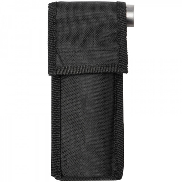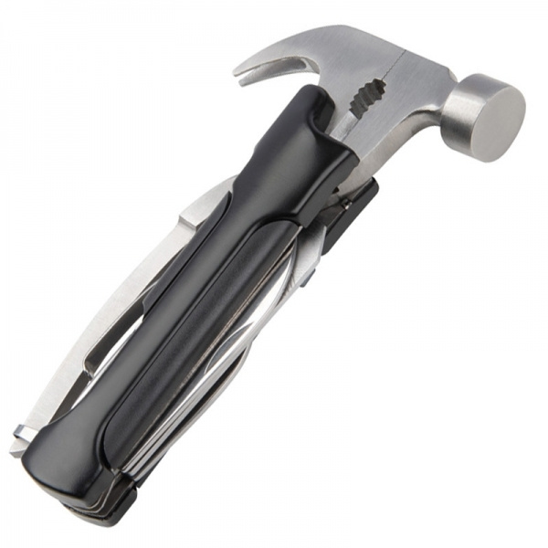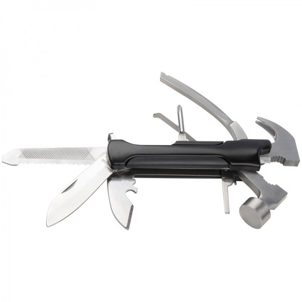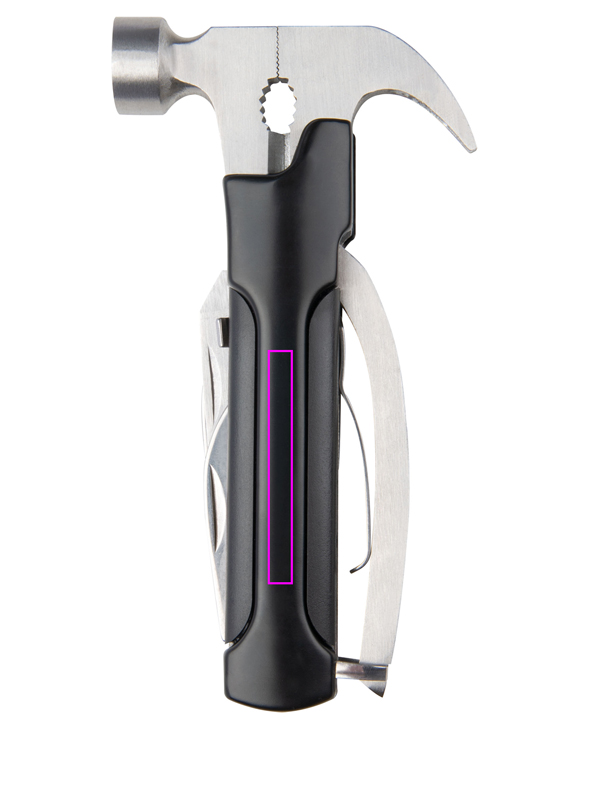 Monitoimityökalu (ruostumaton teräs), joka koostuu vasarasta, viilasta, kahdesta terästä, sahasta, uraruuvitaltasta ja pullonavaajasta. Mukana on yhteensopiva kotelo, jonka keskelle painamme logosi.