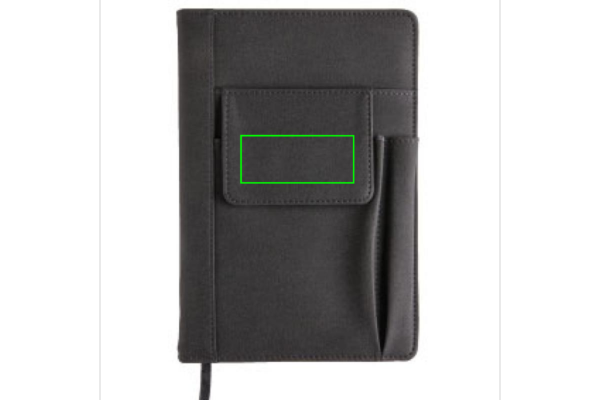 Päällystetty PU-muistikirja, jossa etutasku puhelimelle (14x10cm), tasku kynälle ja päätasku esimerkiksi varavirtalähteelle tai käyntikorteille. Musta sivunjakaja ja 160 sivua 80g/m2. A5 lehtiö kansien sisällä vaihdettavissa.
